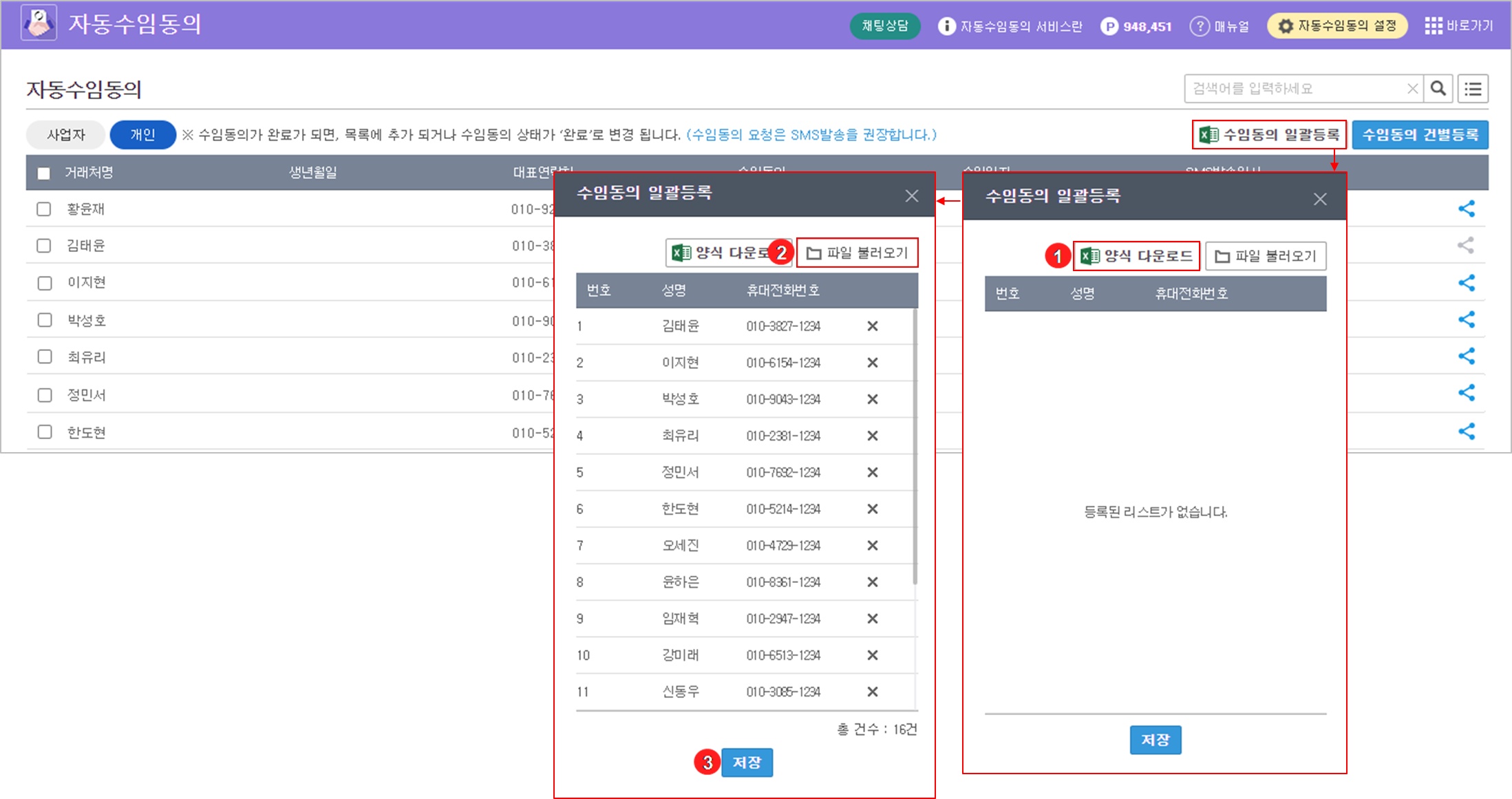 ② 다운로드한 엑셀 파일에 고객의 성명과 휴대폰 번호를 정확히 입력한 다음 {파일 불러오기}를 통