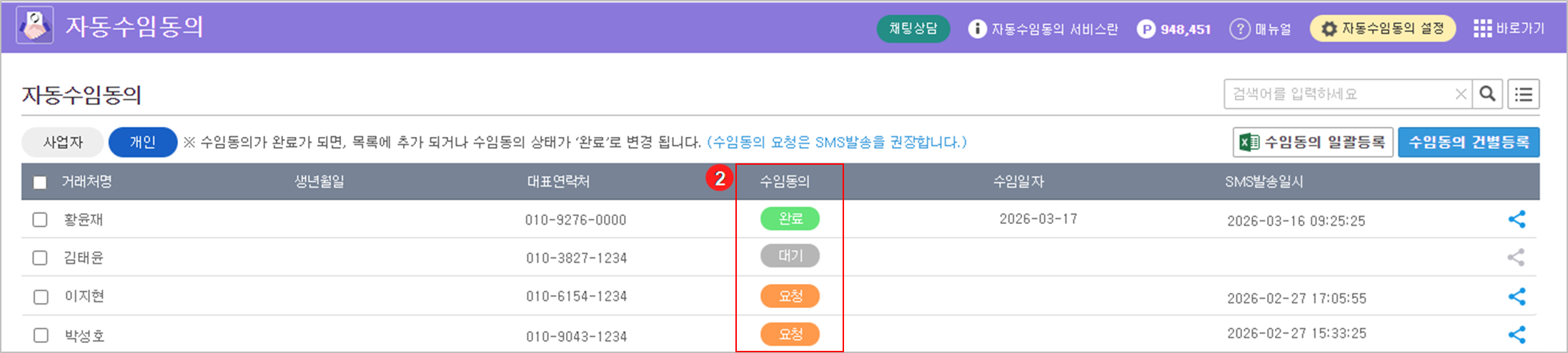 일반 개인 고객의 수임동의는 [개인] 탭에서 더욱 신속하게 처리할 수 있습니다.