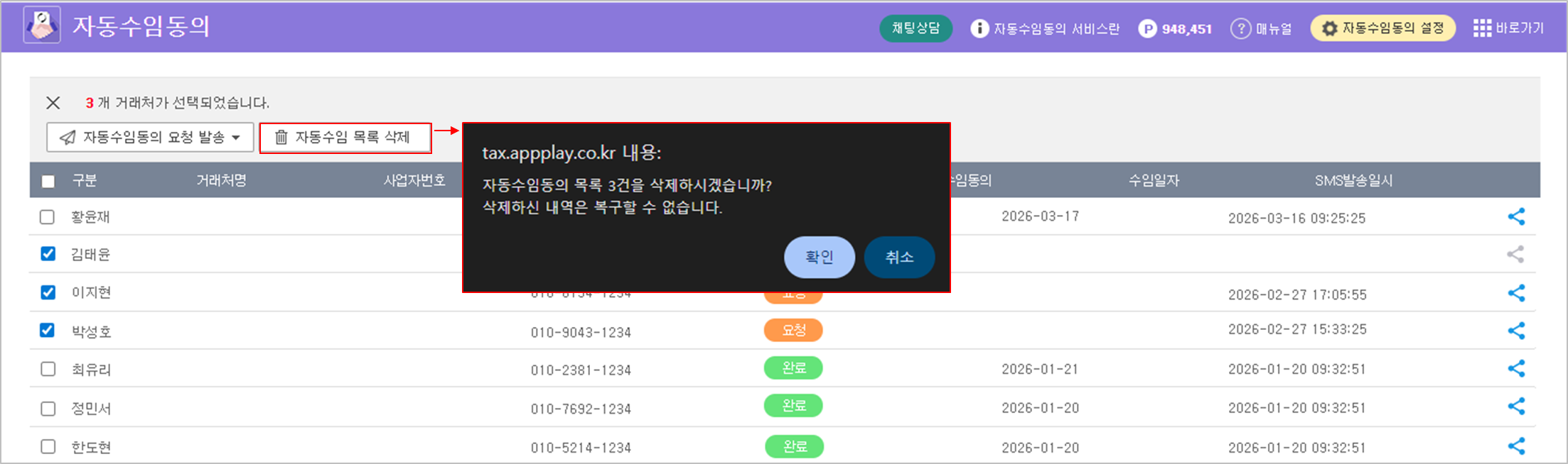 삭제할 거래처를 선택한 후 [자동수임 목록 삭제]를 클릭하여 삭제 가능하며, 수임동의 상태와 상관없이 모든 데이터의 일괄 삭제가 가능합니다.