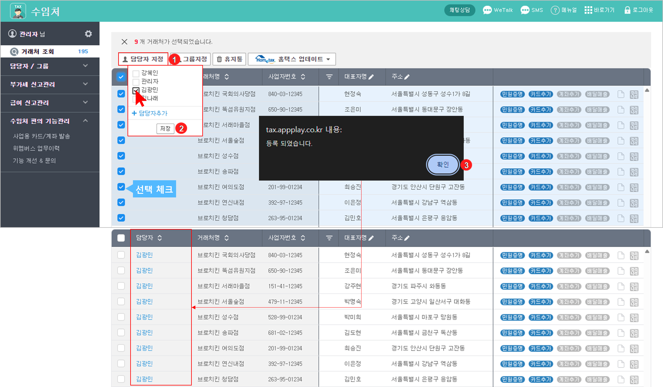 ① 배정할 거래처를 선택 후 버튼이 생성되면 {담당자 지정}을 클릭합니다.