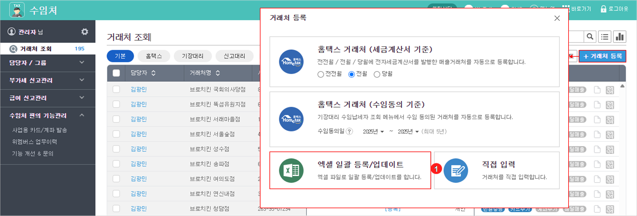 ① 수임처 앱 메인화면에서 [거래처 등록]을 클릭 후, [엑셀 일괄 등록/업데이트]를 선택합니다.