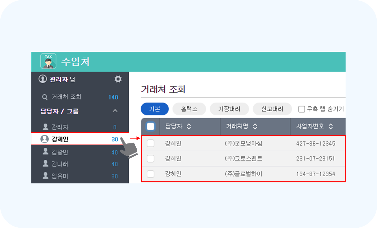 거래처별 담당자 지정이 완료되면 왼쪽 메뉴바에 표기된 담당자명을 클릭하여 배정된 담당자 거래처 정보를 간편하게 확인할 수 있습니다.
