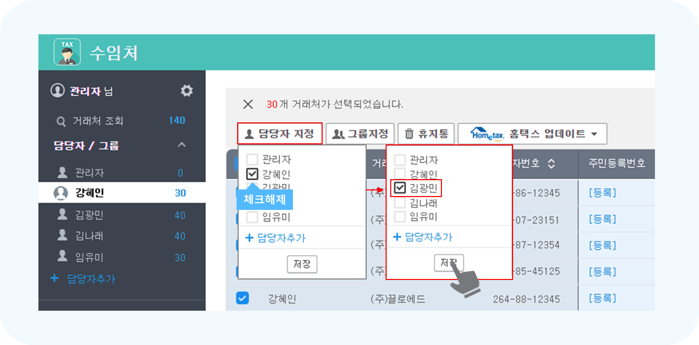 ② 담당자 목록에서 해당 직원의 체크박스에 체크 후 {저장}을 클릭합니다.