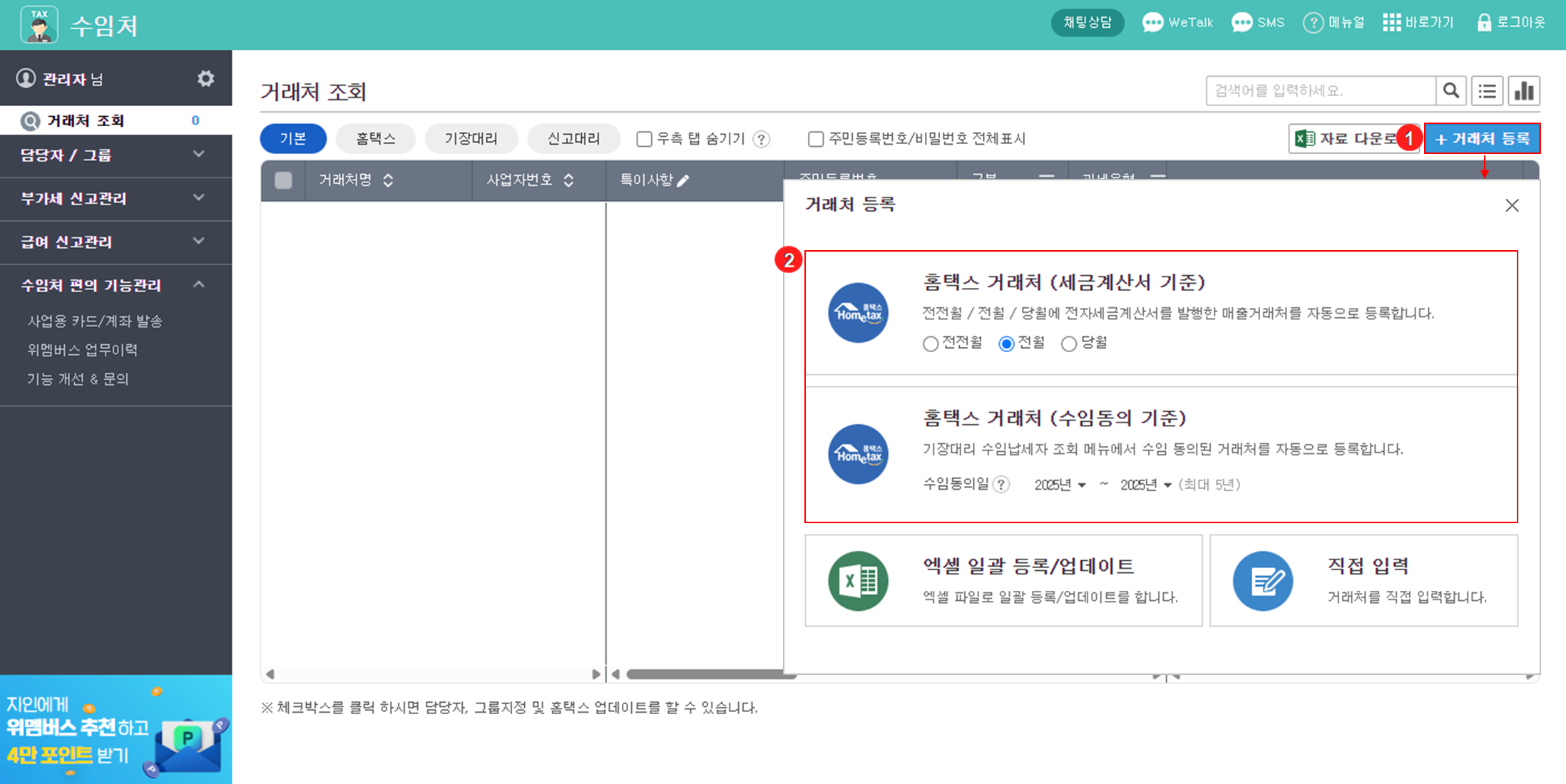 1-2) 수임동의 기준 : [홈택스>기장대리 수임납세자 조회] 메뉴에서 수임 동의된 거래처를 자동으로 등록합니다.