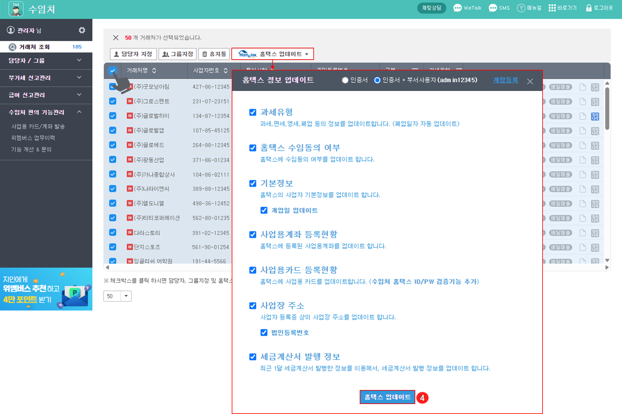 2) 홈택스 업데이트 실행 : 선택한 거래처에 대해 {홈택스 업데이트} 버튼을 클릭합니다.