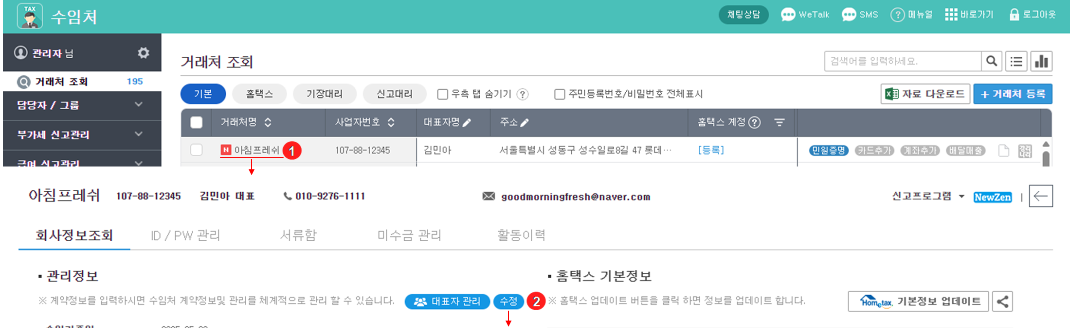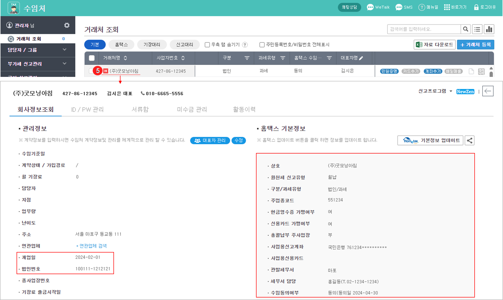 홈택스 업데이트가 완료되면 거래처 기본 정보가 반영되어 상세내역을 확인할 수 있으며, 필요 시 마다 {홈택스 업데이트}를 통해 정보를 갱신할 수 있습니다.