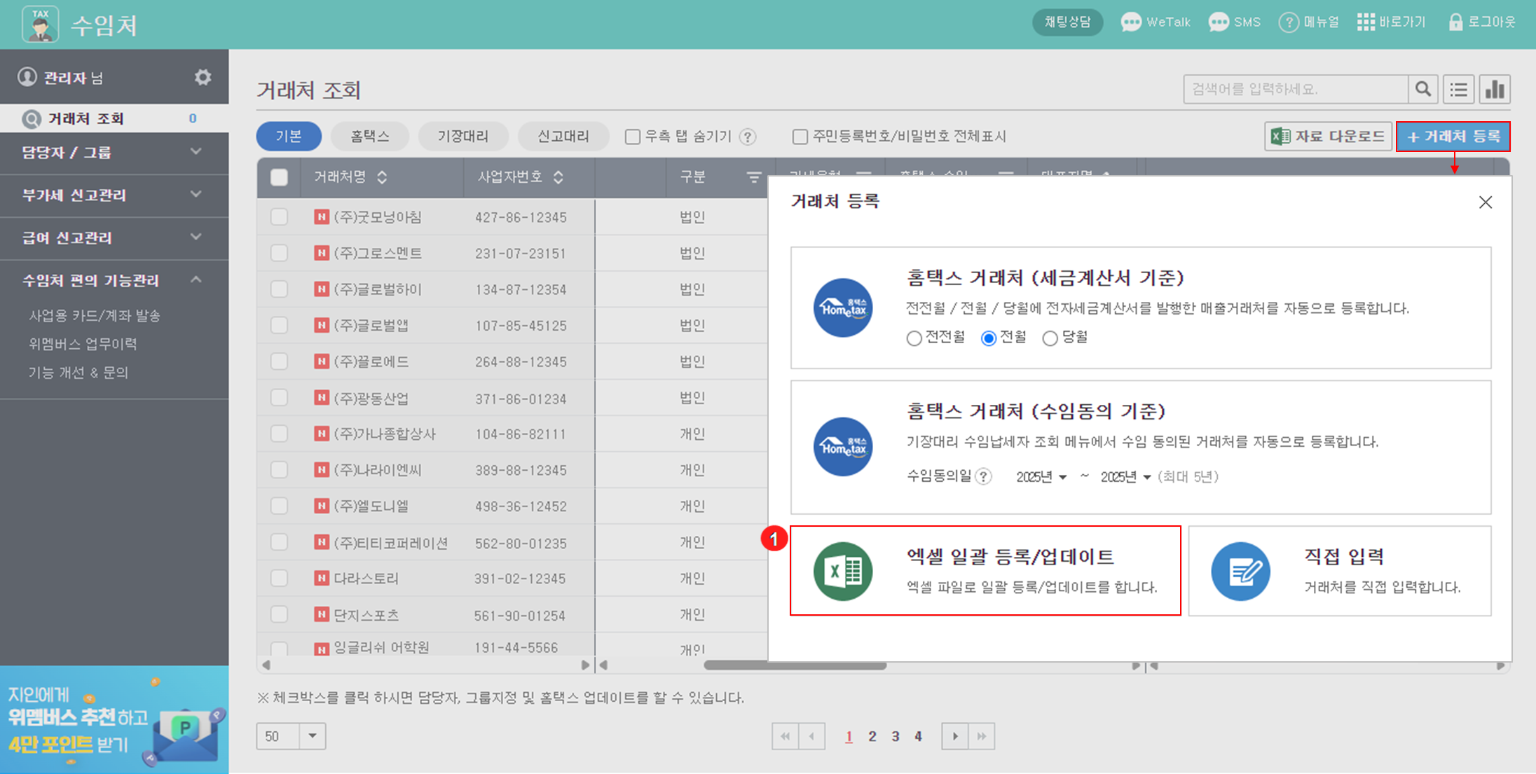 거래처 조회 메인화면에서 {거래처 등록} 버튼을 클릭한 다음 '엑셀 일괄 등록/업데이트' 방식을 클릭합니다.