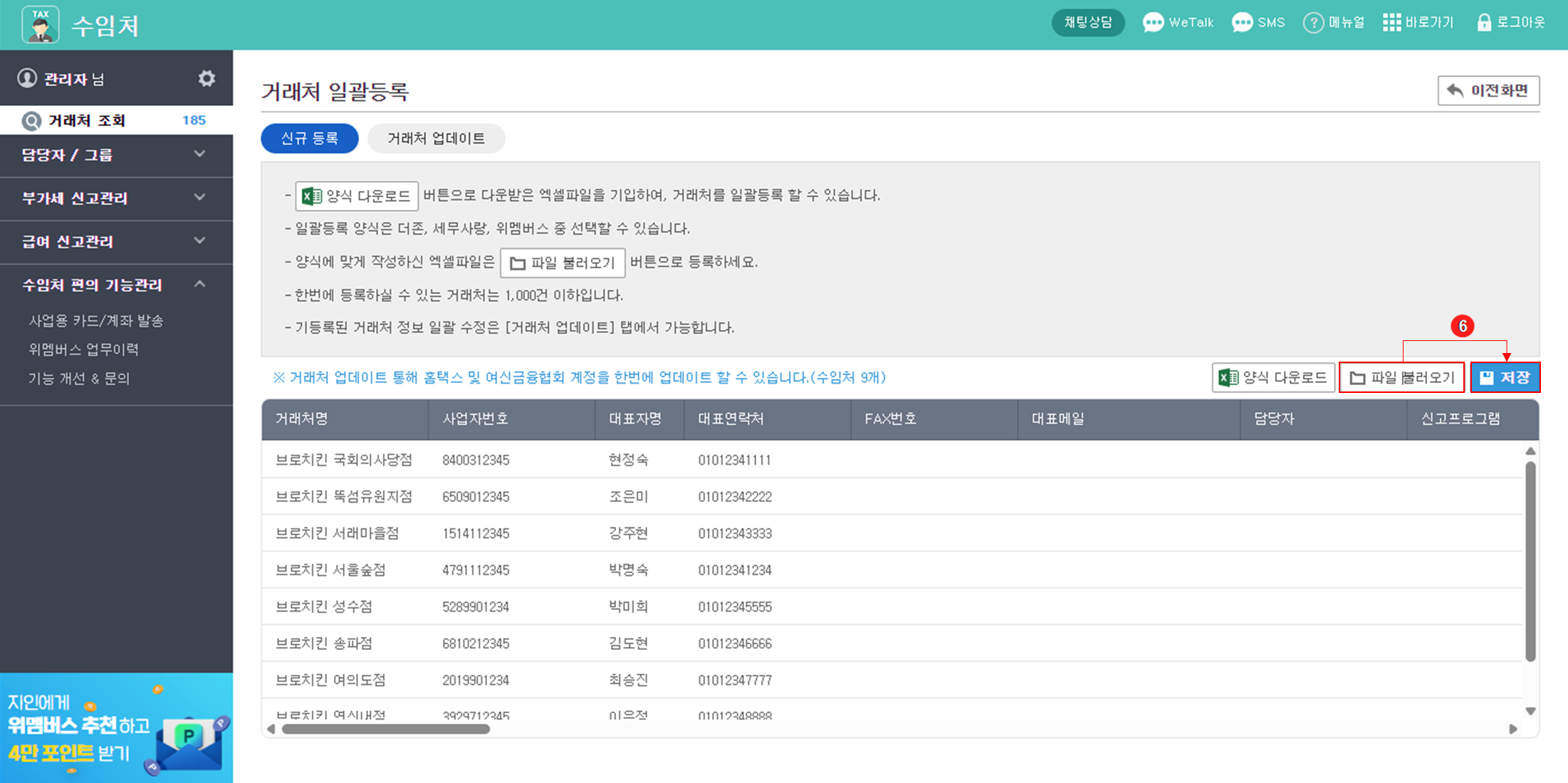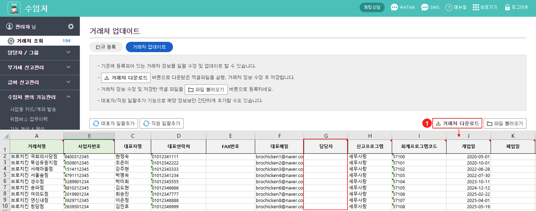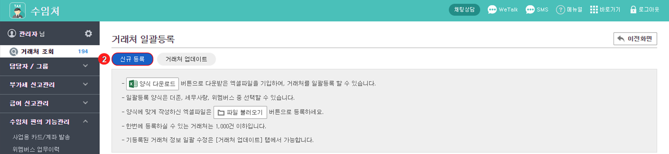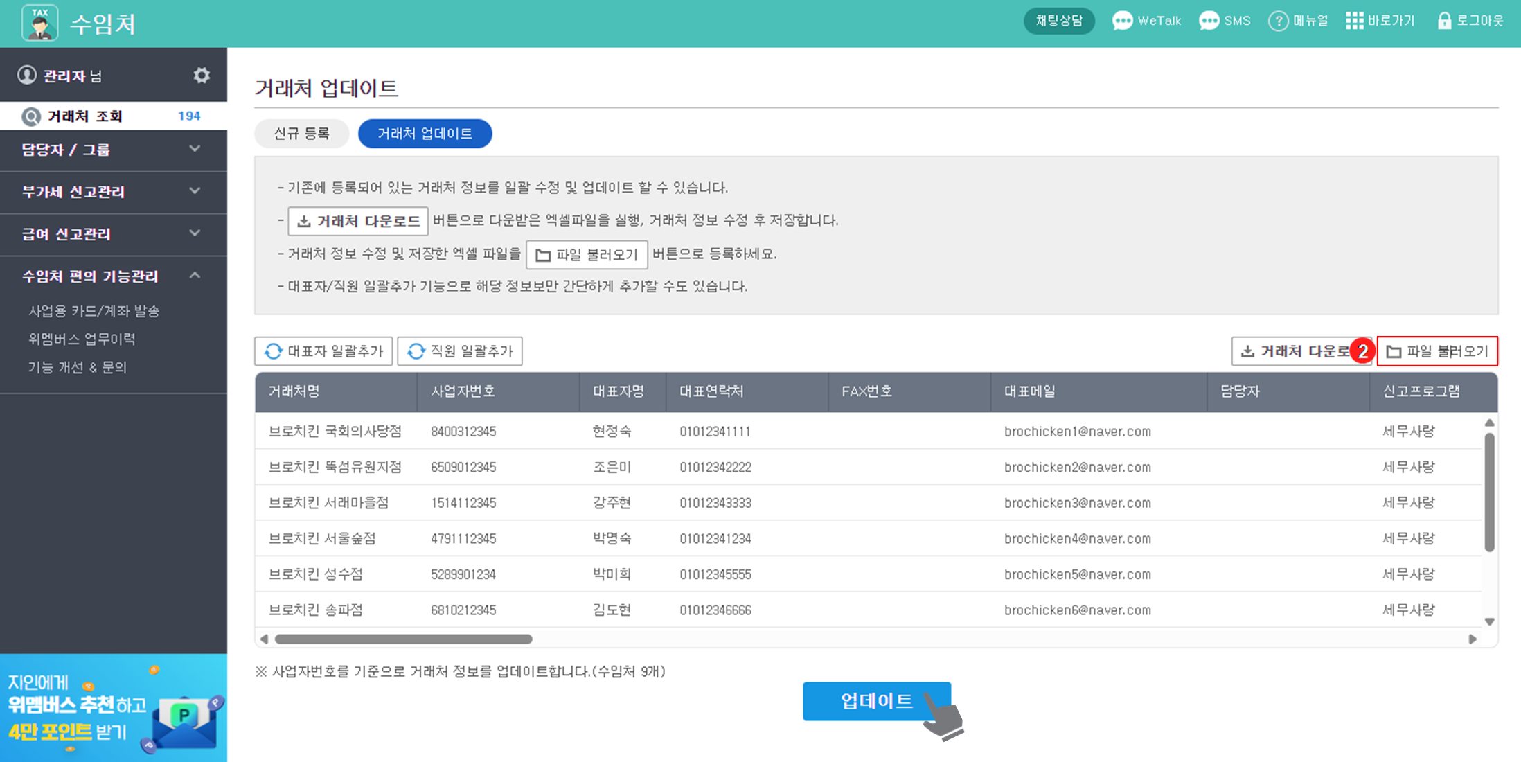 거래처 업데이트 : 이미 등록된 거래처 정보를 일괄로 추가하거나 수정할 때 사용합니다.