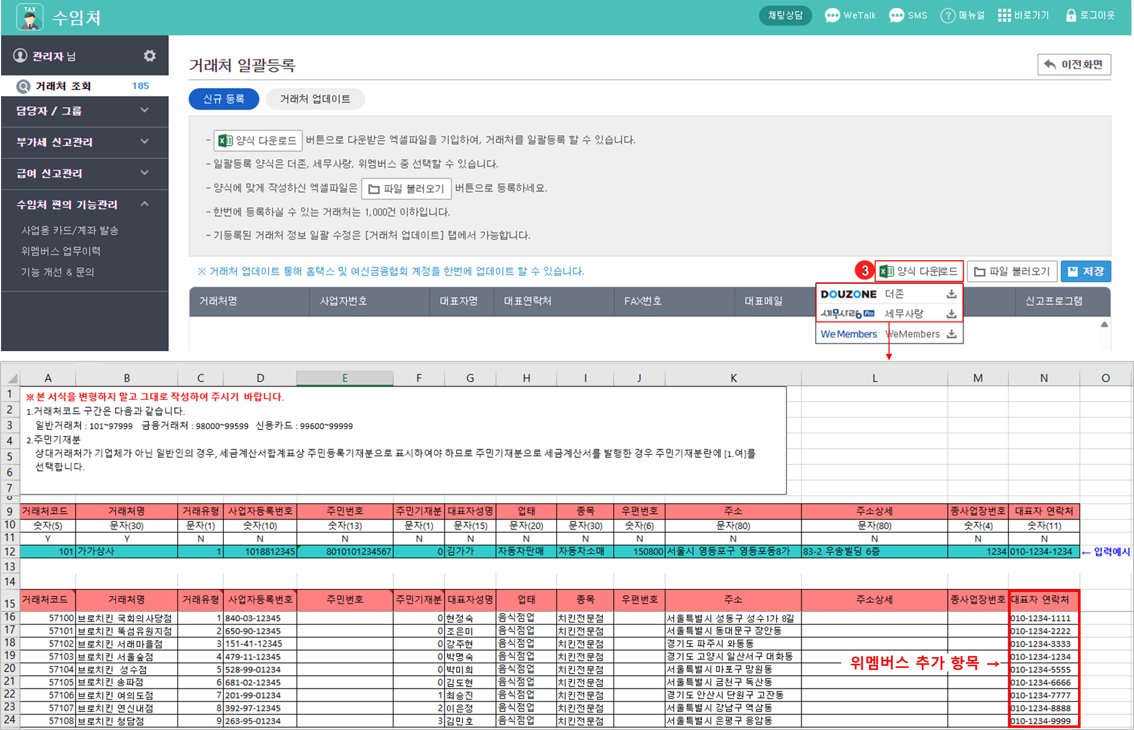 {양식 다운로드} 절차를 생략하고 세무 프로그램에서 내려받은 거래처 정보를 바로 업로드할 수 있지만, '대표자 연락처' 항목은 위멤버스에서 제공하는 양식에만 포함되어 있으므로, 해당 양식으로 작성하시기를 권장드립니다.