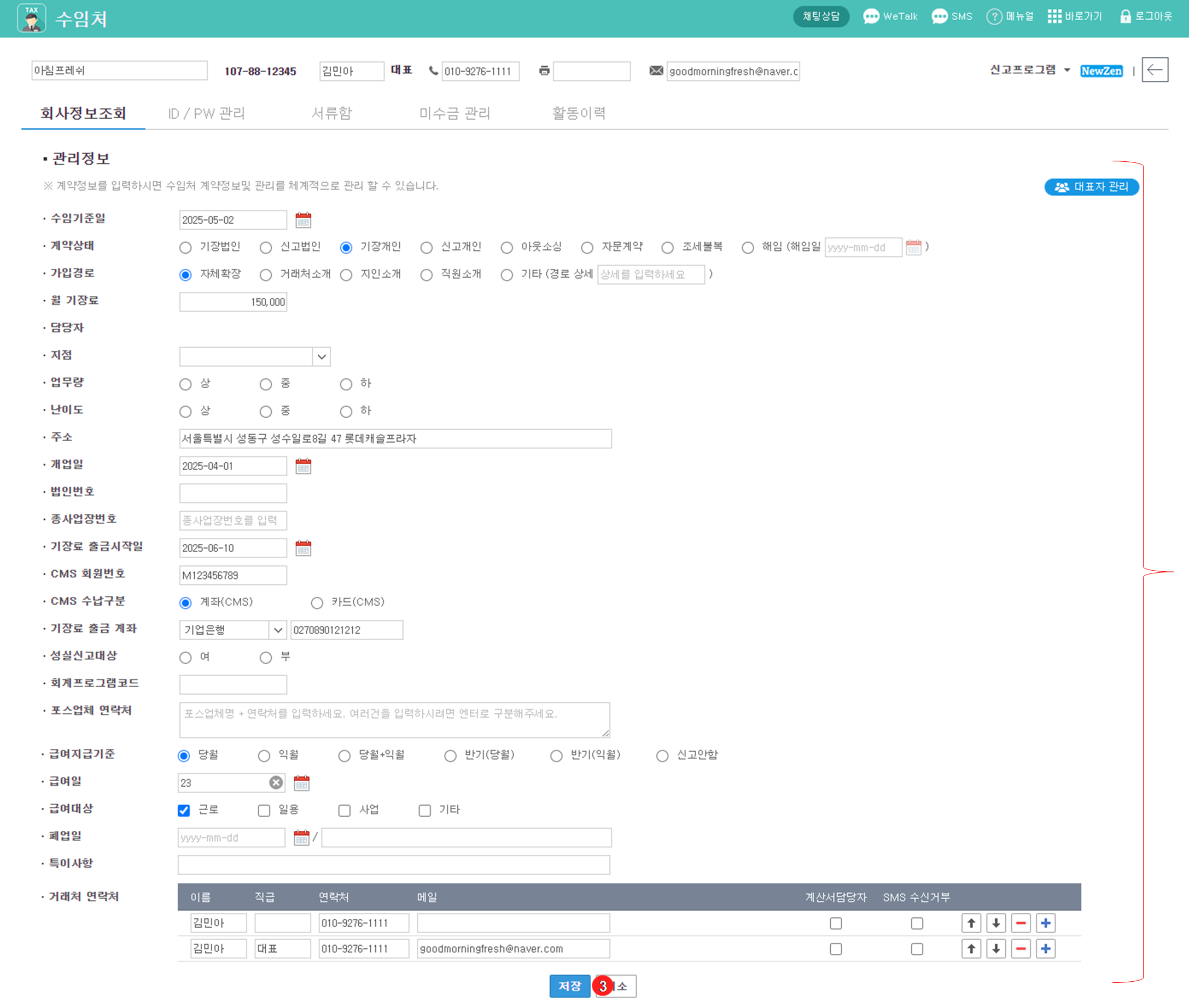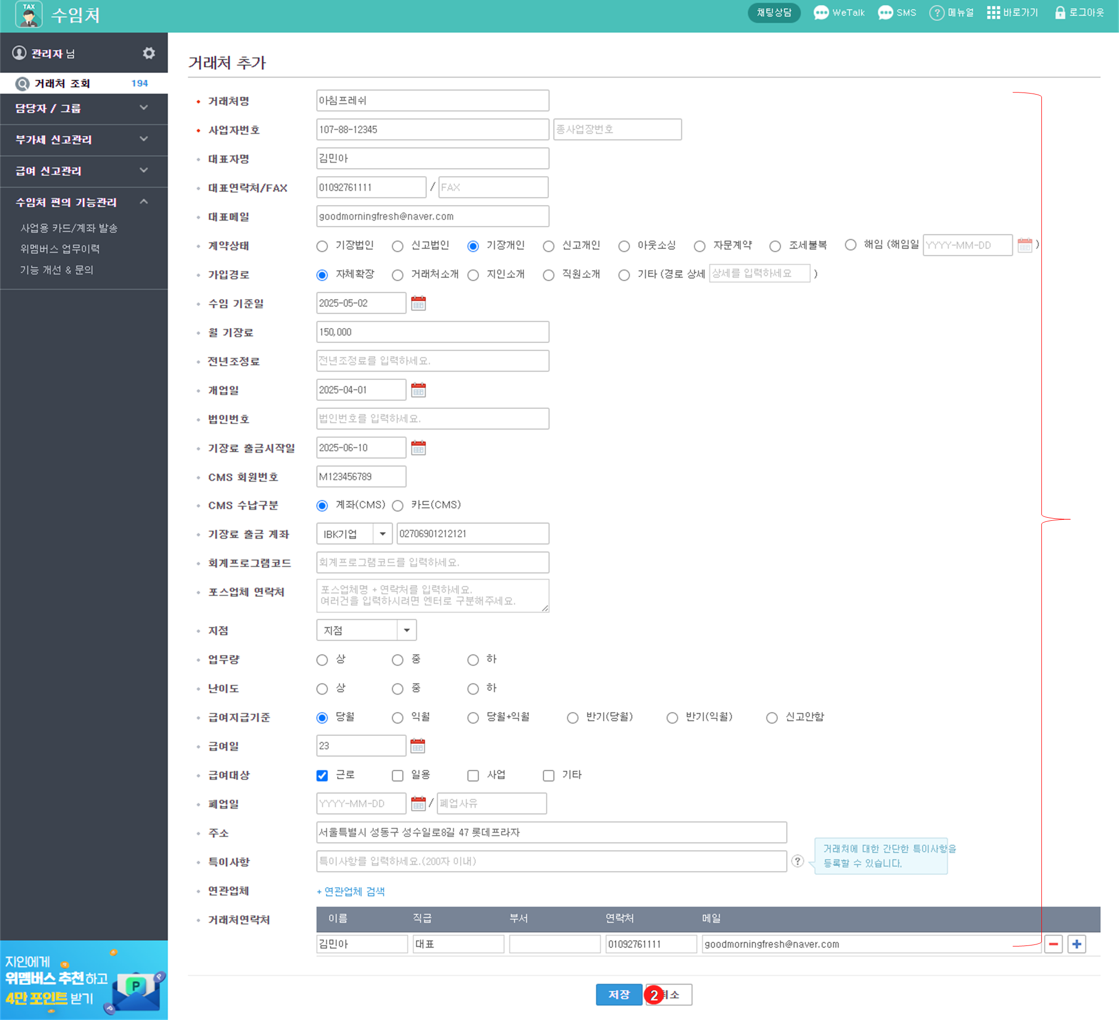 관리하고자 하는 모든 정보를 입력 후 {저장}을 클릭하면 거래처 등록이 완료됩니다.