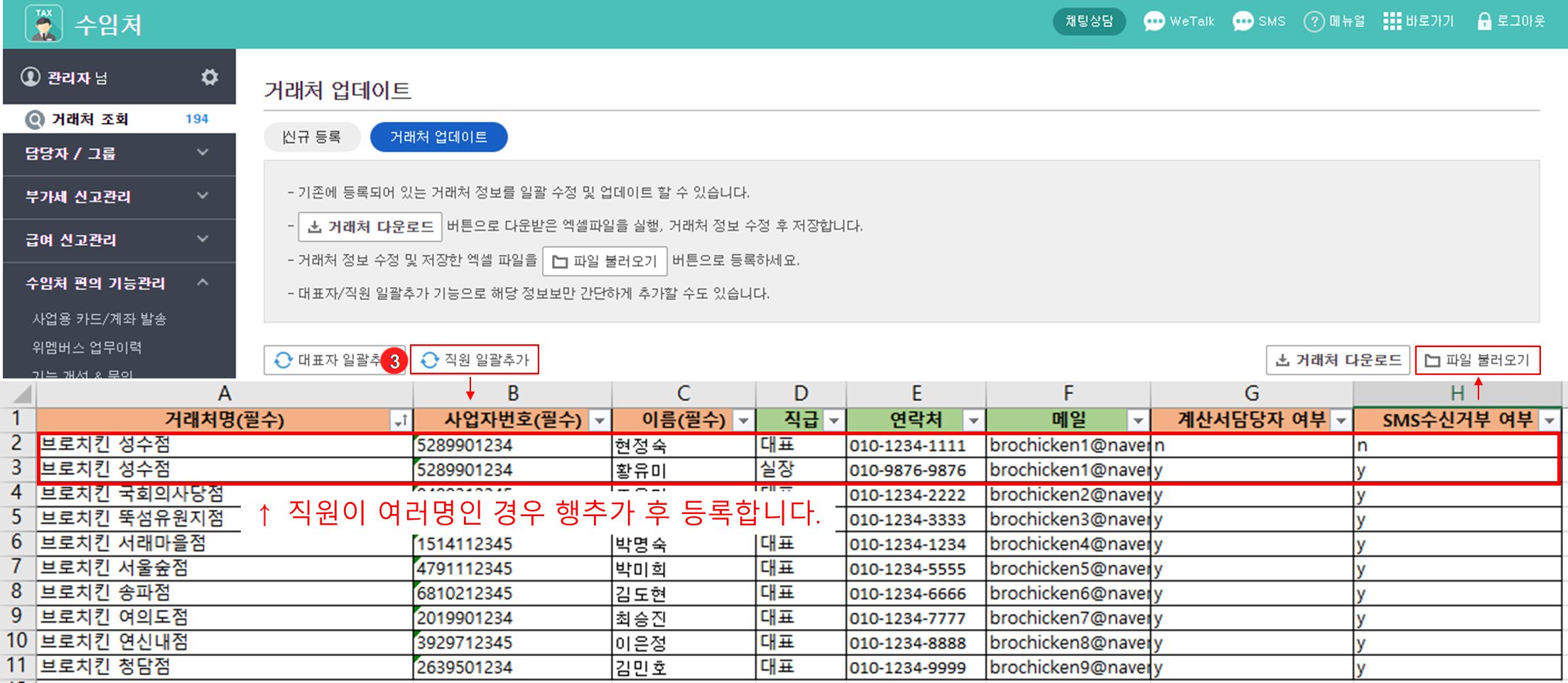 거래처명, 사업자번호가 기재된 내역이 엑셀로 일괄 다운로드 되면 직원 성명, 연락처, 메일주소, 계잔서 담당자 여부, SMS 수신거부 여부를 기재합니다.