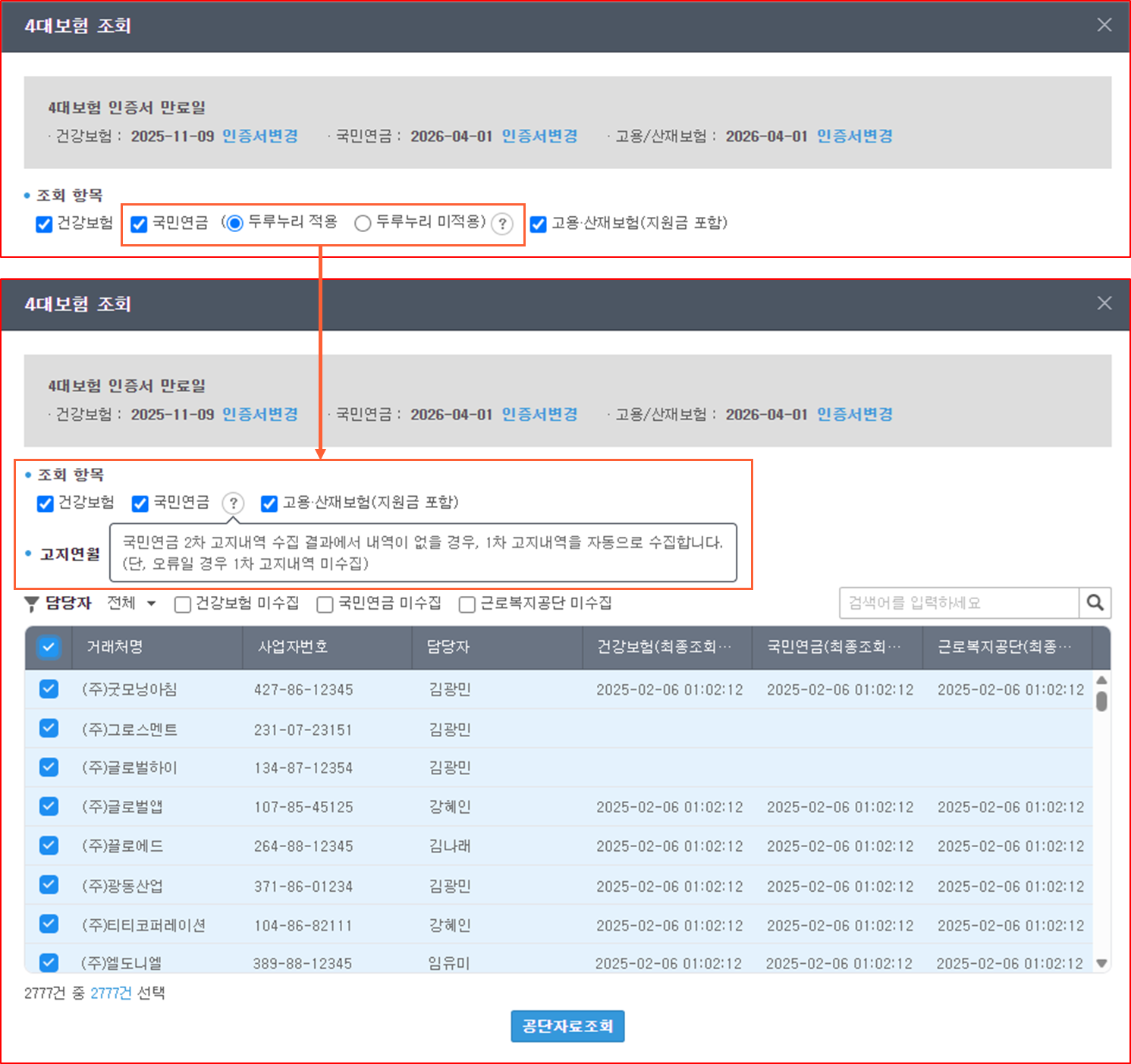 두루누리 미적용 체크 시 : 국민연금 EDI에서 2차 내역이 고지되기 전 1차 고지내역을 미리 조회