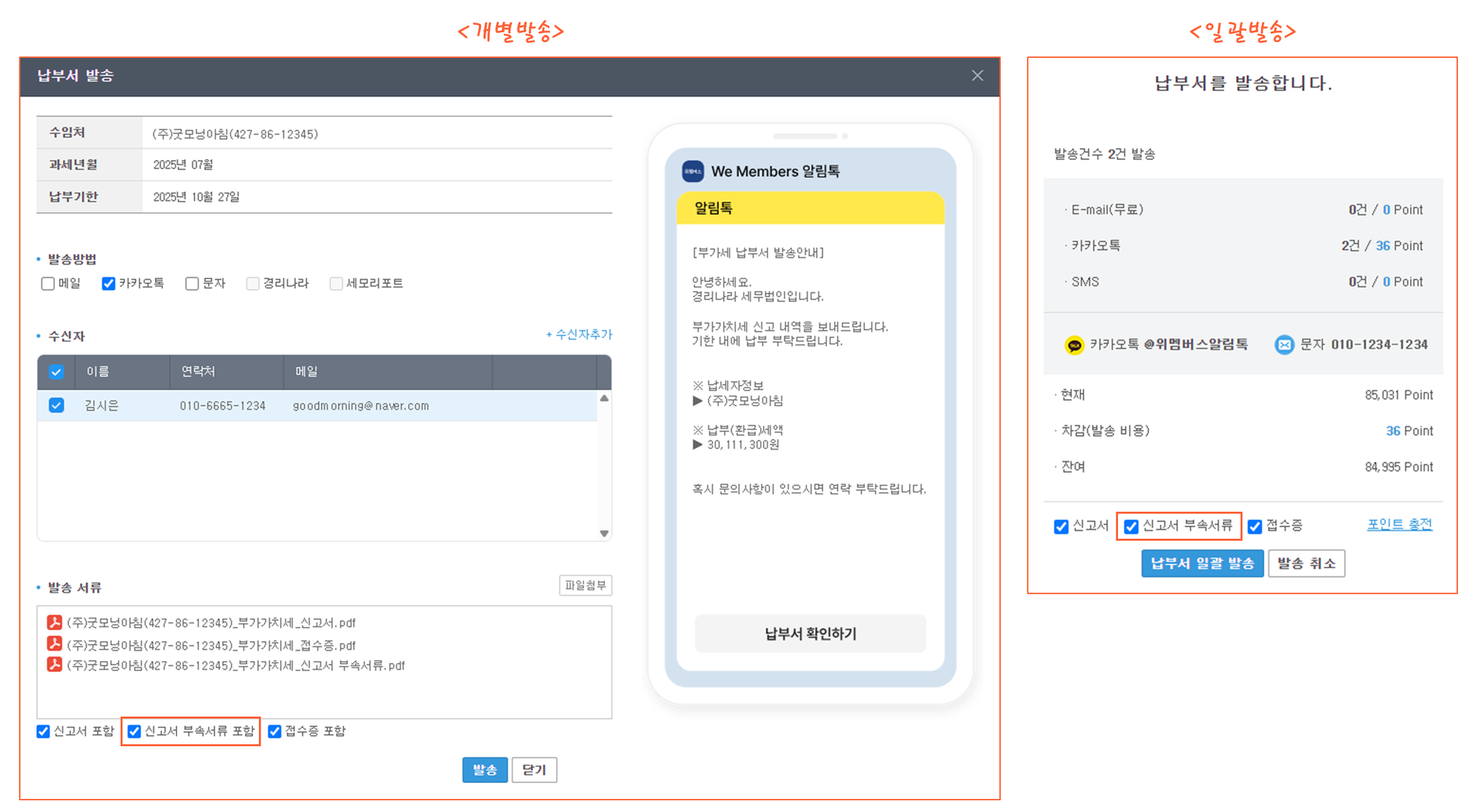 부가세 납부서 건별/일괄 발송 시 '신고서 부속서류' 선택 옵션 추가