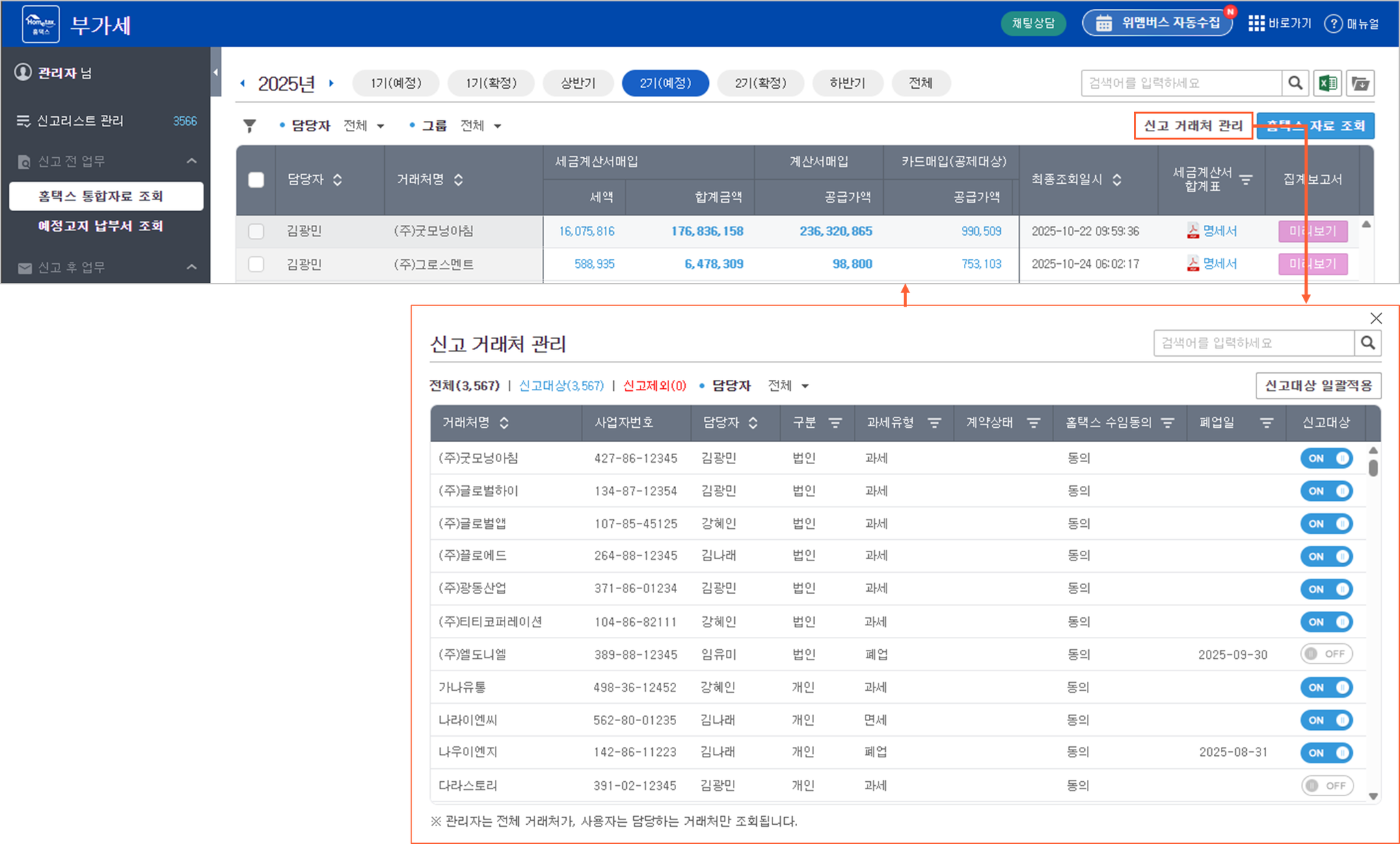 [신고 거래처 관리]에서 신고 대상을 OFF로 설정한 거래처의 경우, 수집된 홈택스 통합자료가 조회 화면에 노출되지 않도록 개선