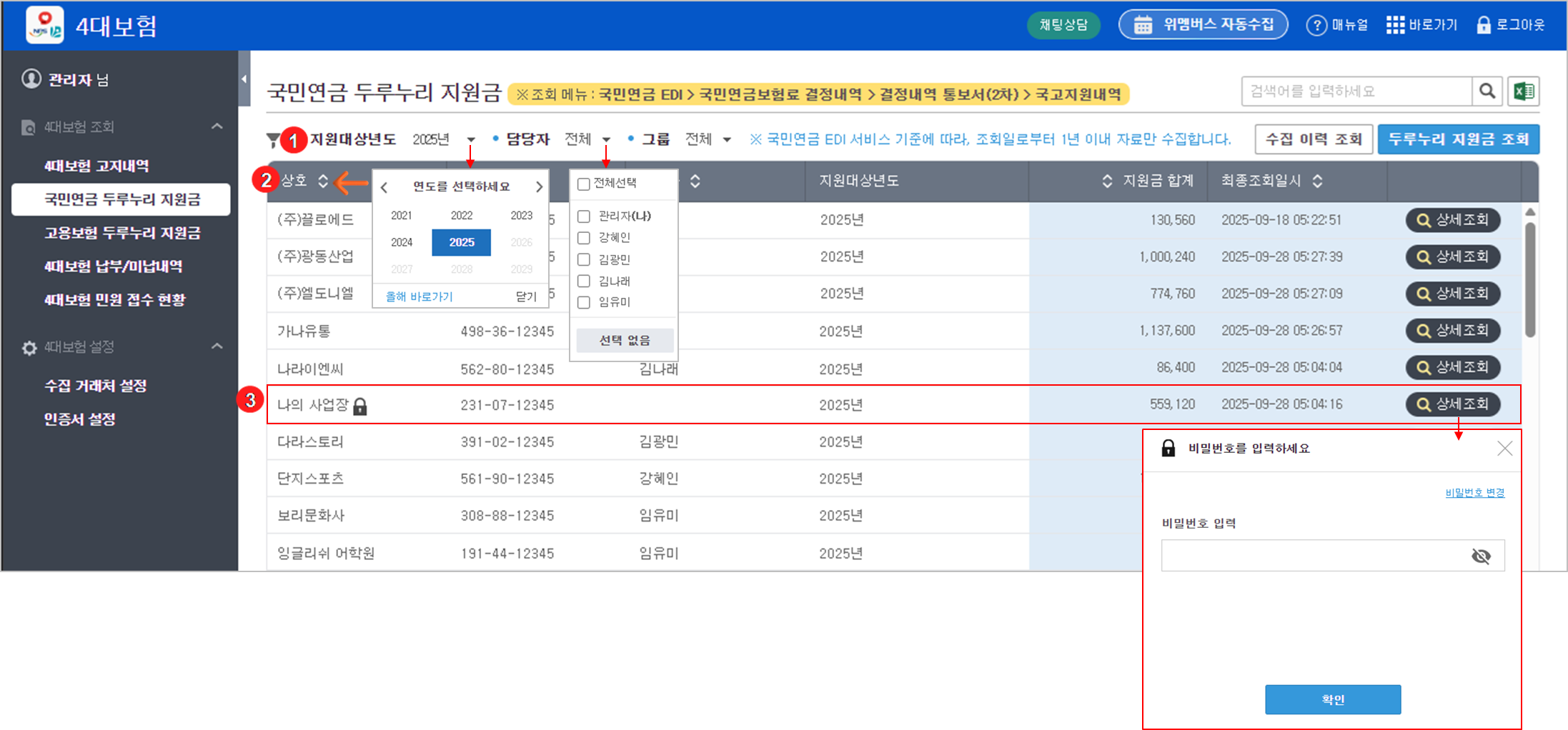 세무사무실 본인 두루누리 내역은 [상세조회] 클릭 후 비밀번호 입력을 통해 확인할 수 있습니다.