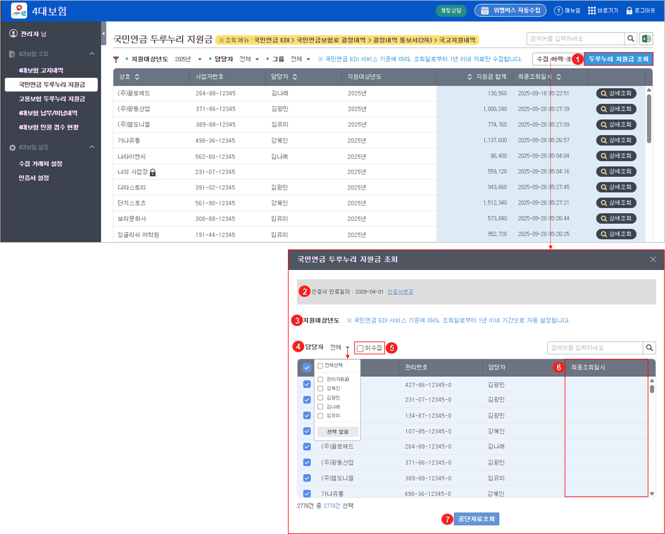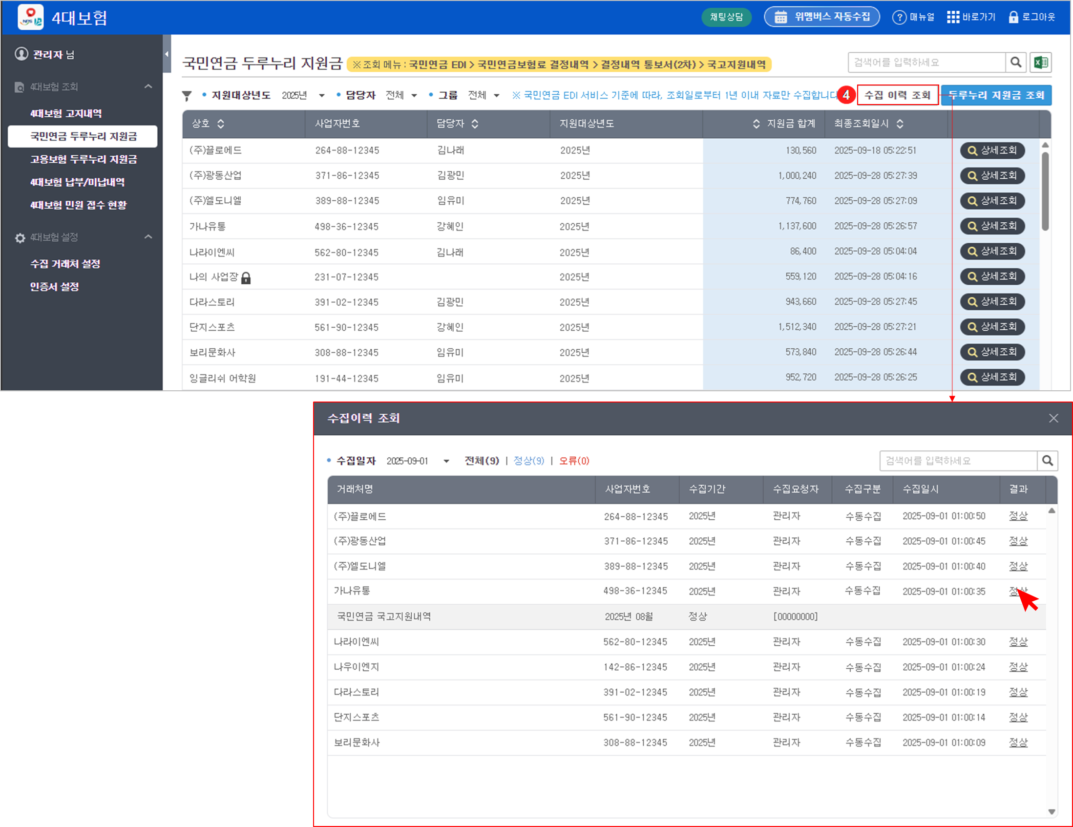 국민연금 두루누리 지원금 내역은 고지내역과 동일하게, 스케줄러를 통해 매월 설정된 수집일의 오전 1시부터 순차적으로 자동 수집됩니다.