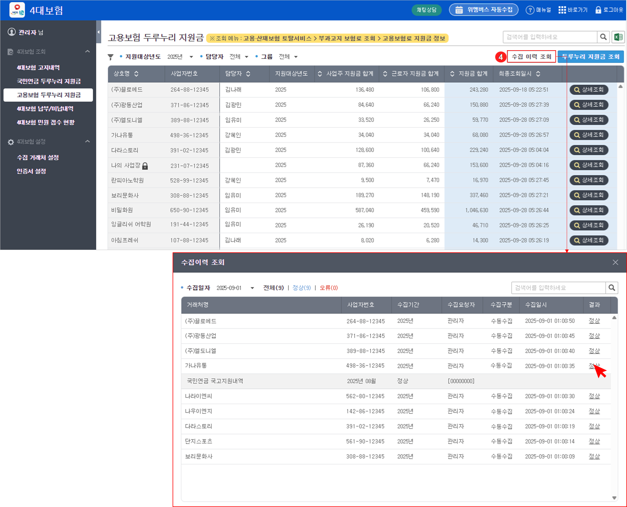 고용보험 두루누리 지원금 내역 또한 고지내역과 동일하게, 스케줄러를 통해 매월 설정된 수집일의 오전 1시부터 순차적으로 자동 수집됩니다.