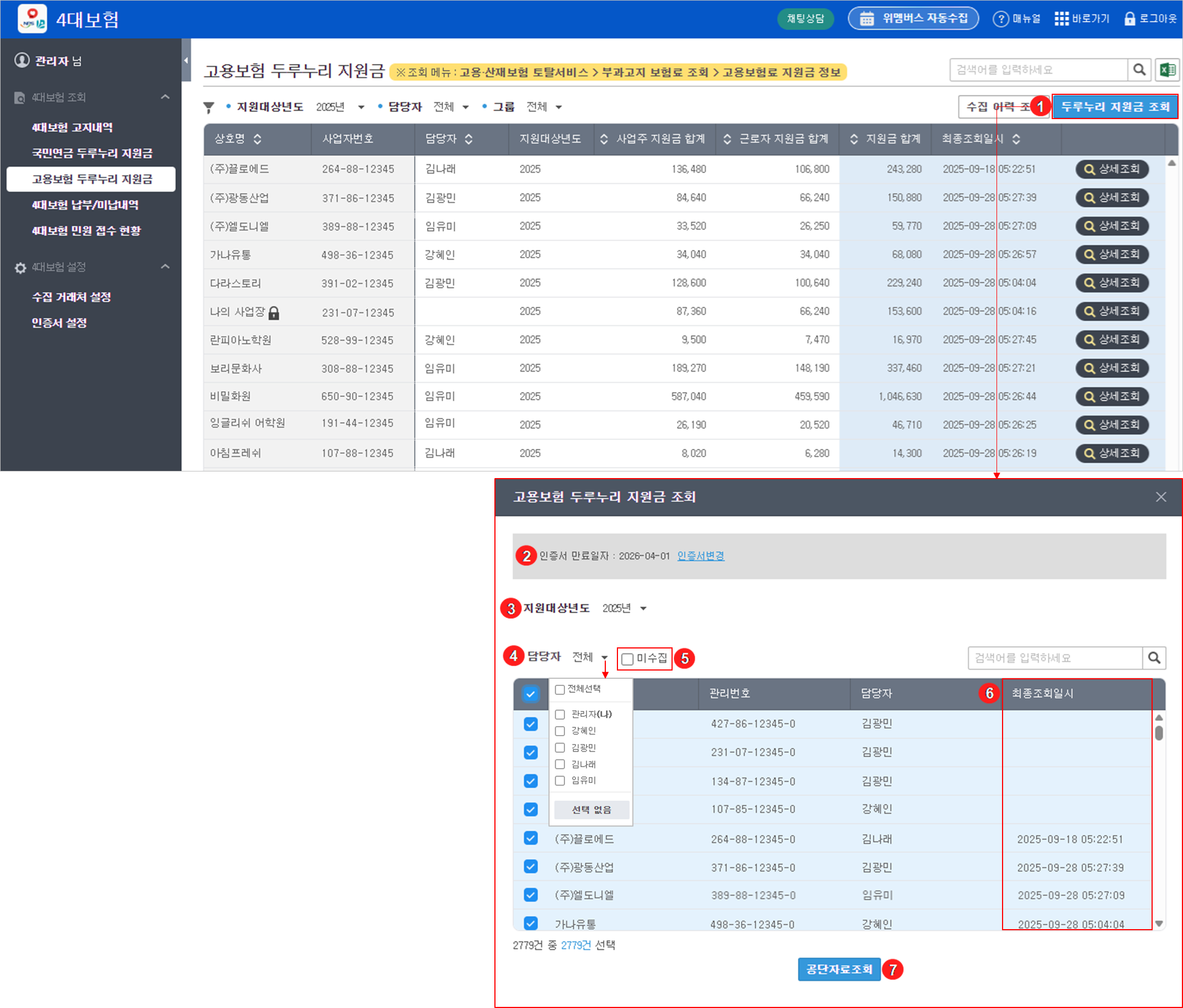 상호명, 담당자, 사업주, 근로자 지원금합계, 지원금 합계, 최종 조회 일시 기준으로 정렬하여 원하는 항목을 빠르게 확인할 수 있습니다.