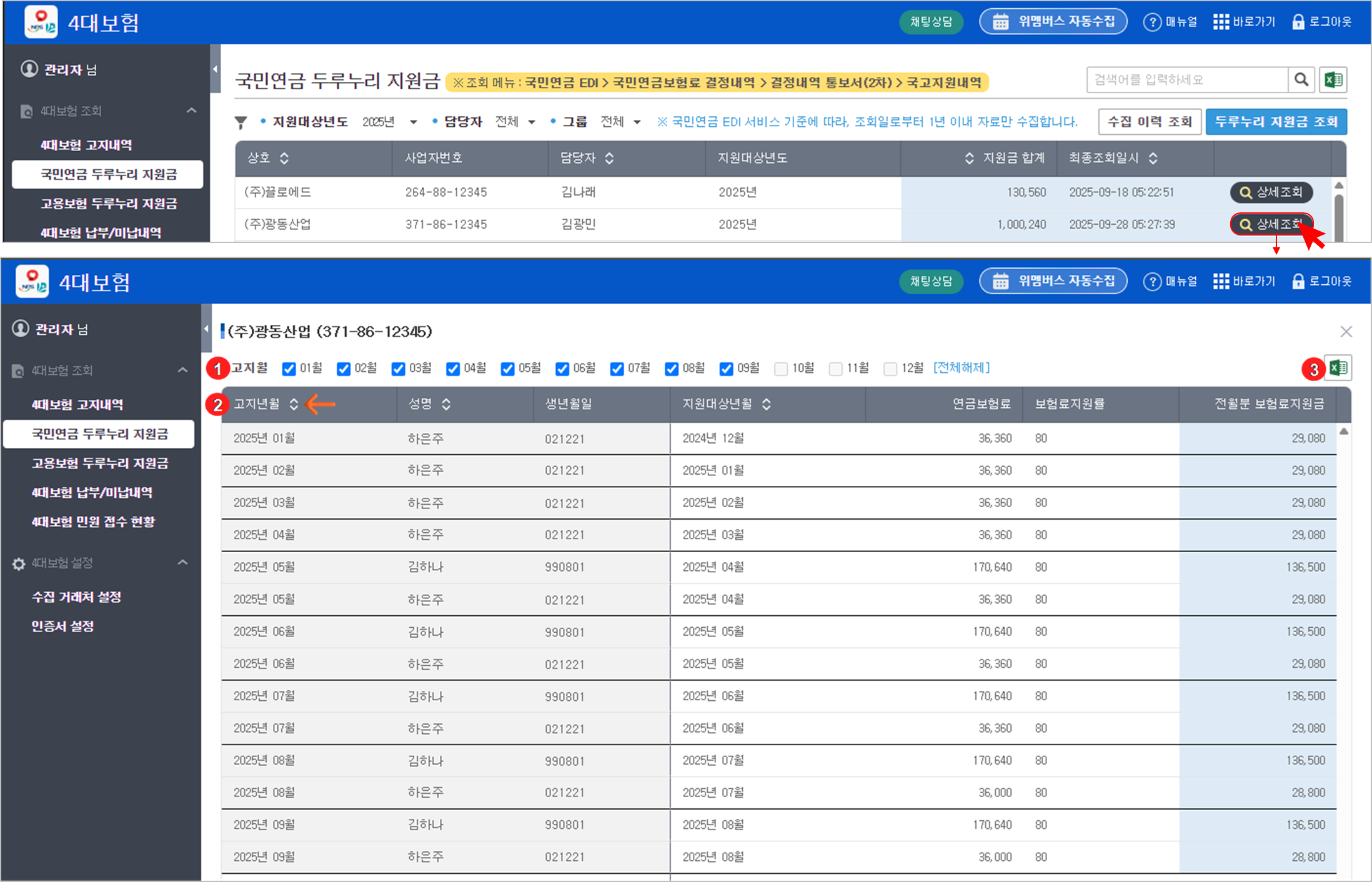 조회할 거래처의 {상세조회} 버튼을 클릭하면 상세조회 화면으로 전환되며, 당해년도 두루누리 지원금 상세내역을 확인할 수 있습니다.