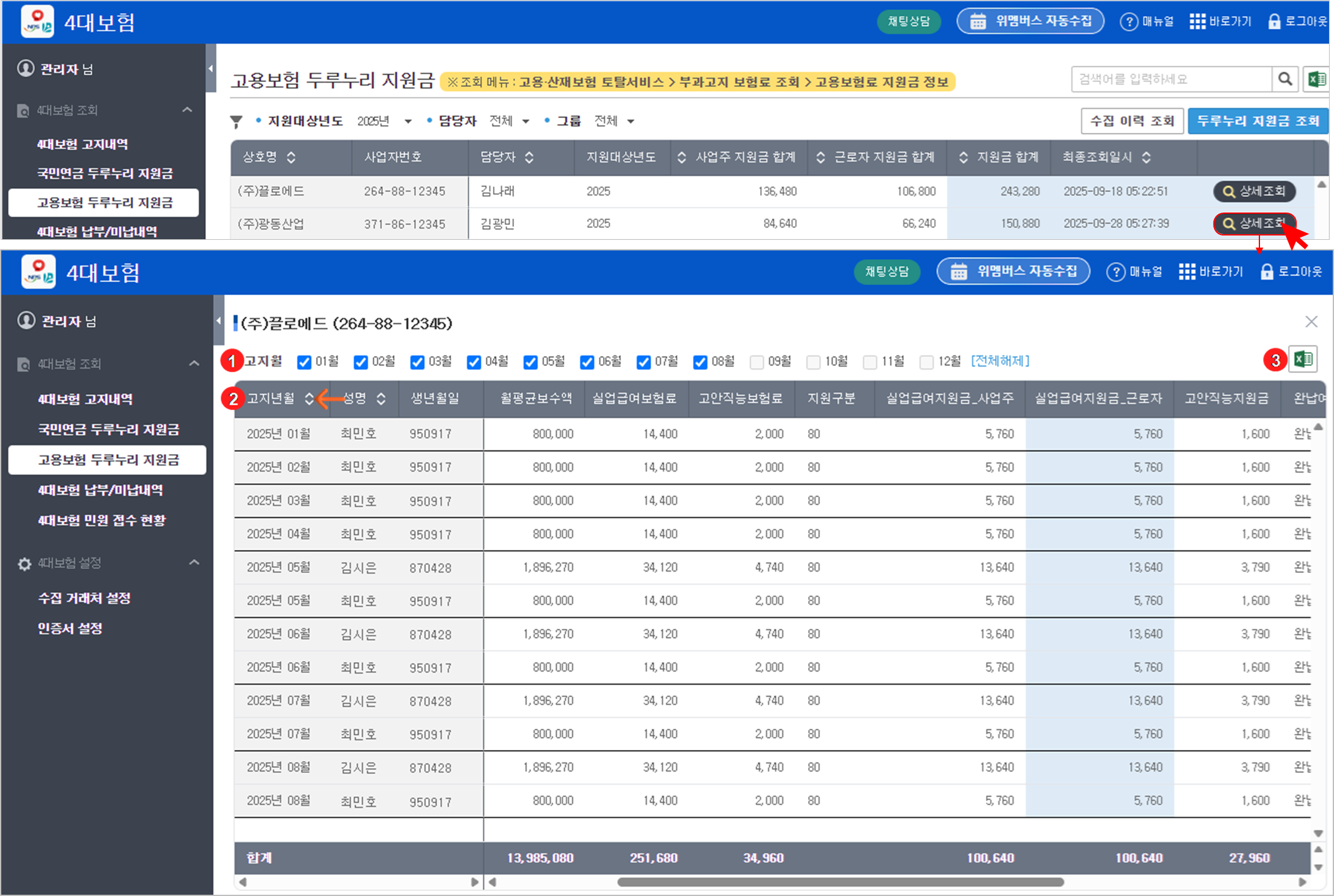 ④ {고용} 탭에서 고용보험료 지원금 정보를 클릭하면 조회되는 데이터
