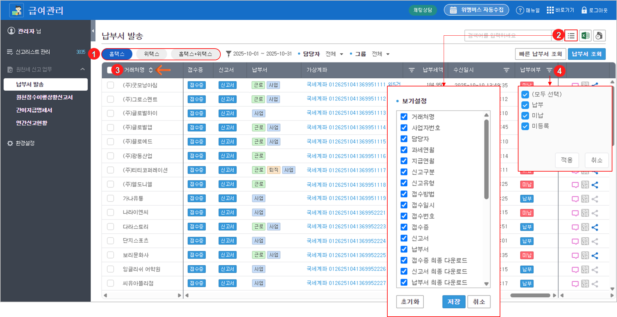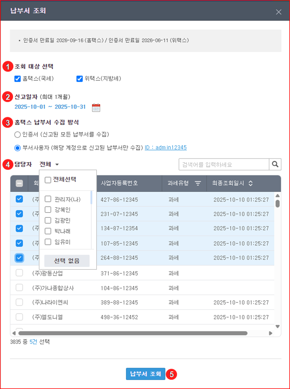 신고기간을 지정하여 모든 거래처의 납부서를 일괄 수집할 수 있습니다.
