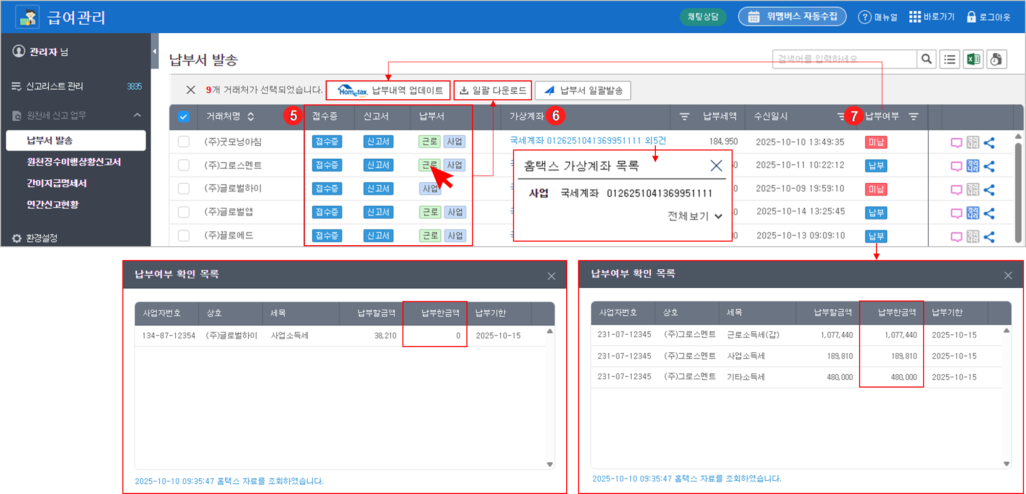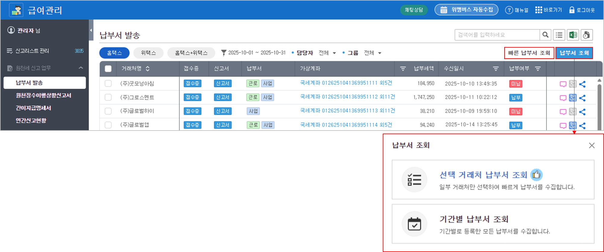 {납부서 조회}를 클릭하면 [급여관리 > 신고리스트 관리 > 급여거래처 관리] 메뉴에서 'ON'으로 설정된 모든 거래처의 납부서를 실시간으로 수집합니다.