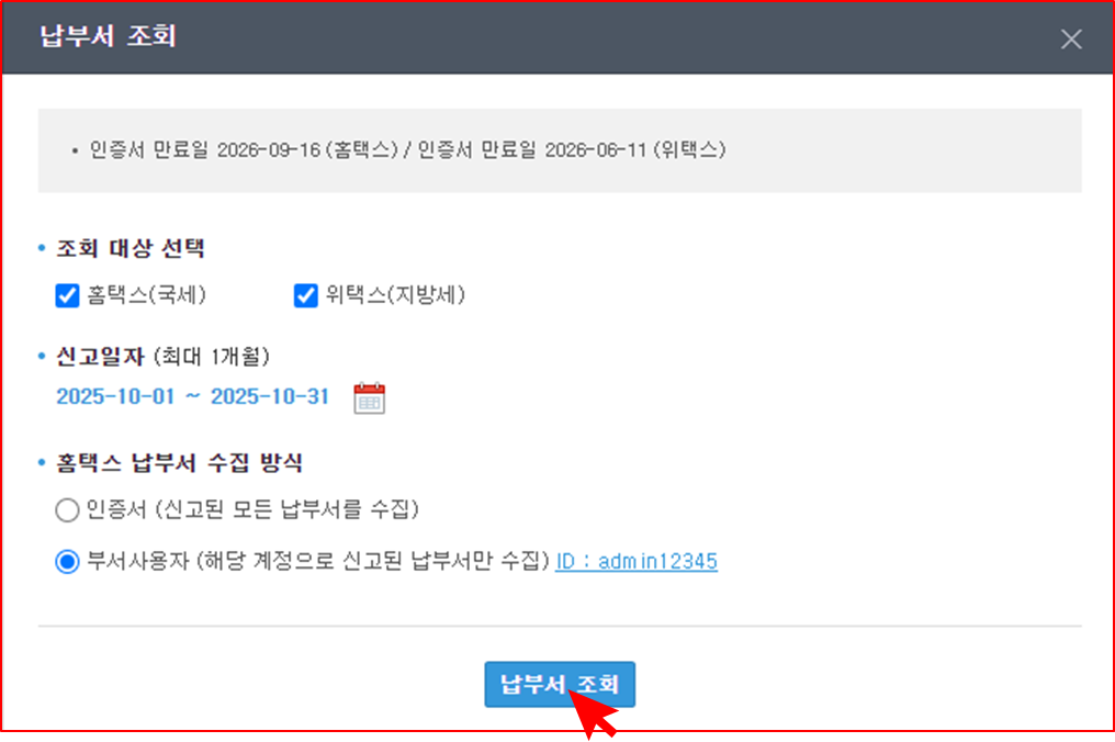 홈택스, 위택스 납부서를 자동 또는 실시간으로 한 번에 조회하고,