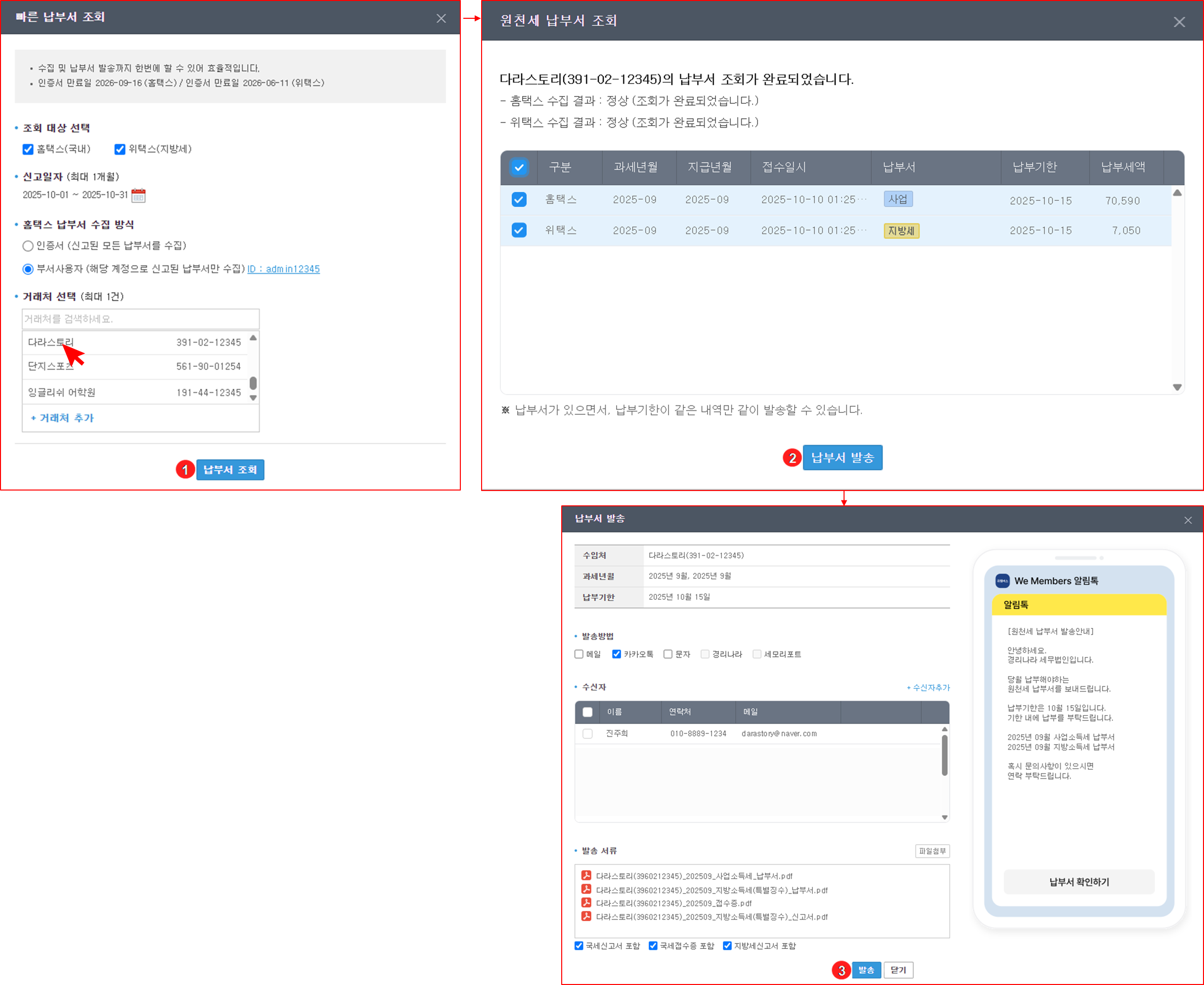 특정 거래처 1곳을 선택하여 납부서 조회부터 발송까지 신속하게 처리할 수 있습니다.