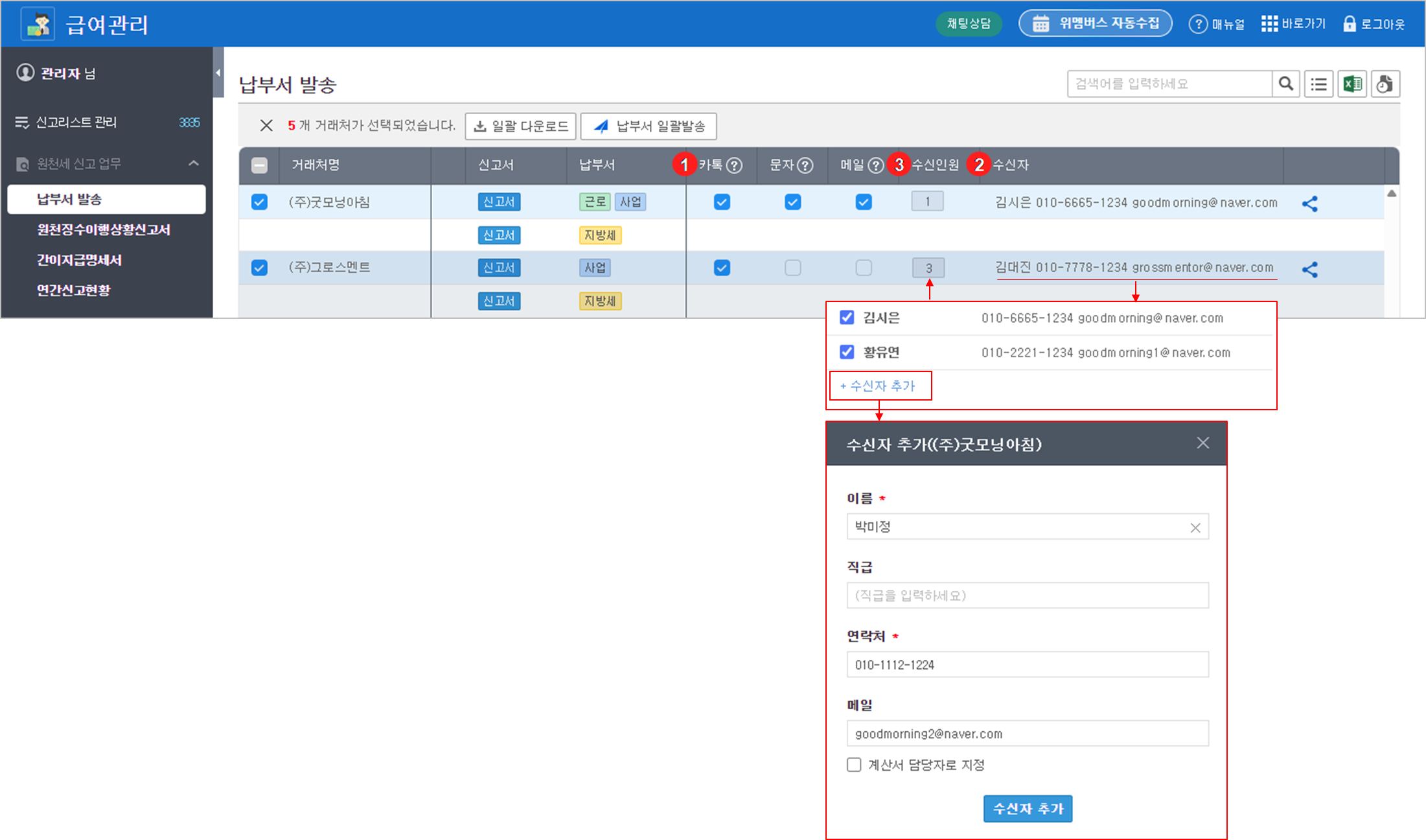 대표자 + 담당자 2명 선택 → 수신 인원 : 3명
