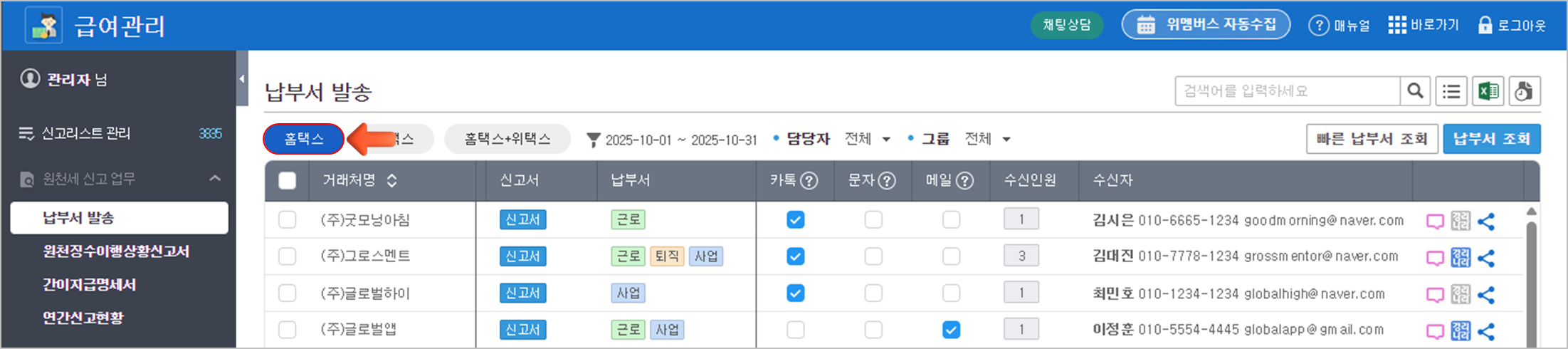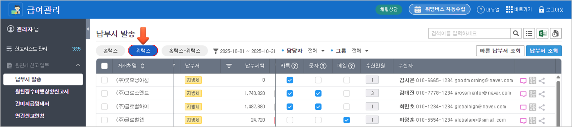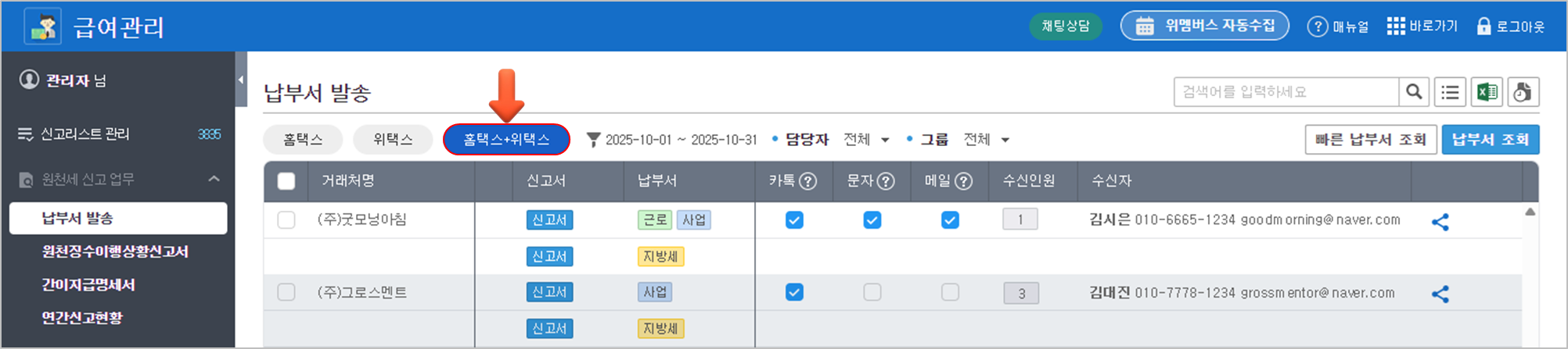 조회된 납부서는 홈택스, 위택스, 홈택스+위택스 탭으로 구분되어 표시되며, 각 탭에서 수집된 납부서를 수임처에 카카오톡, SMS, 이메일로 일괄 또는 개별 발송할 수 있습니다.