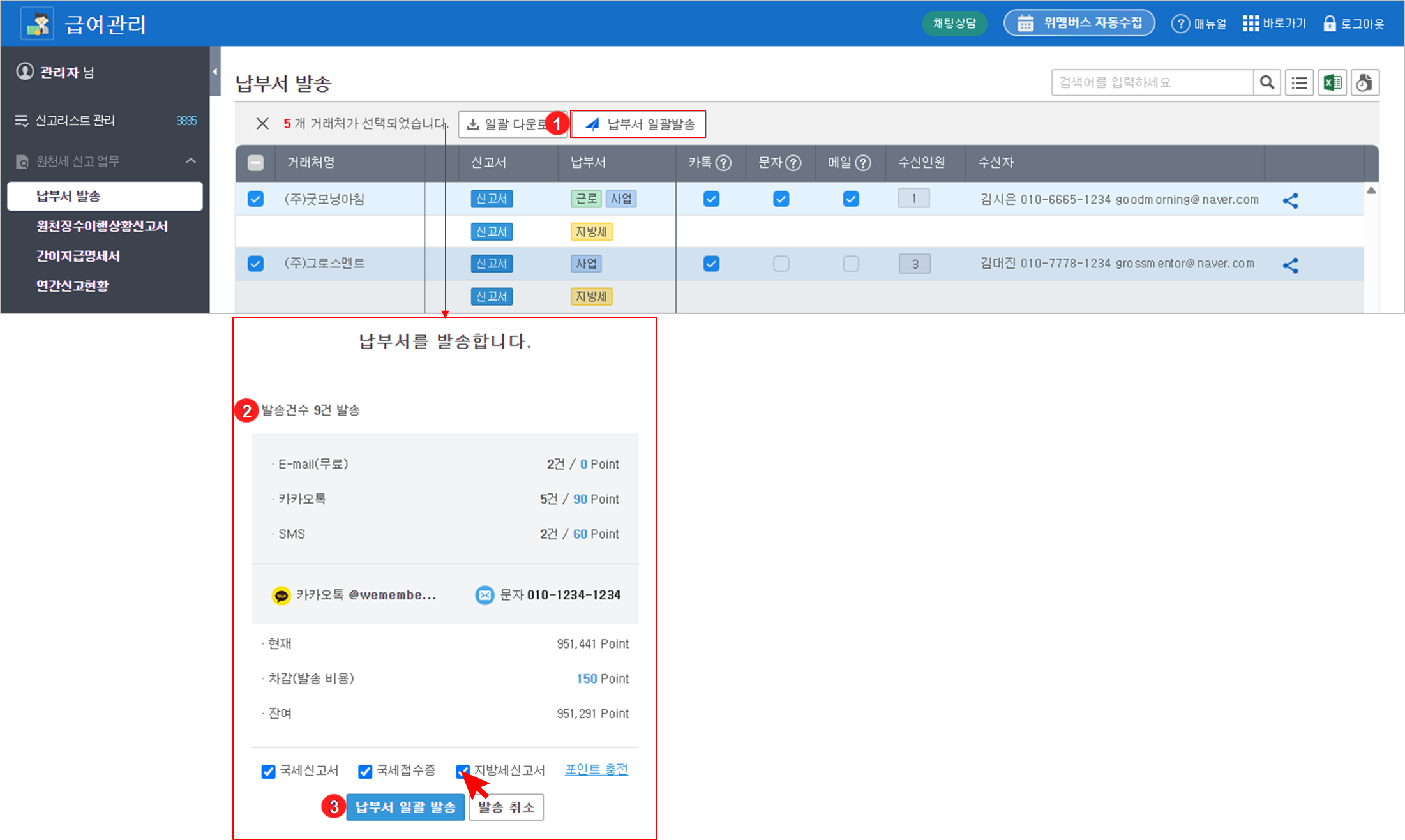 여러 거래처에 납부서를 동시에 발송할 수 있습니다.