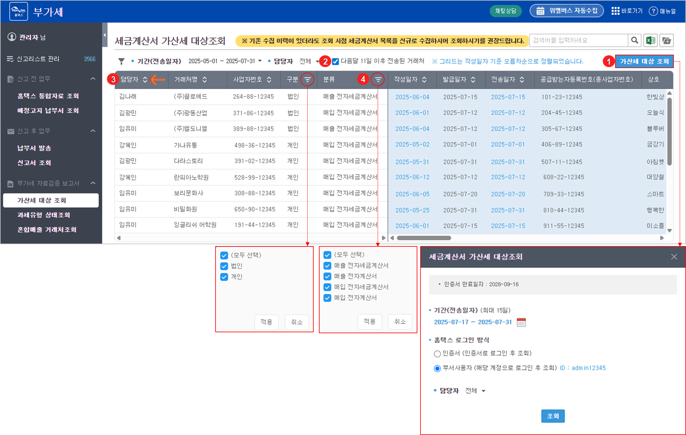 정렬 가능 항목 : 담당자, 거래처명, 사업자번호, 작성일자, 발급일자, 전송일자