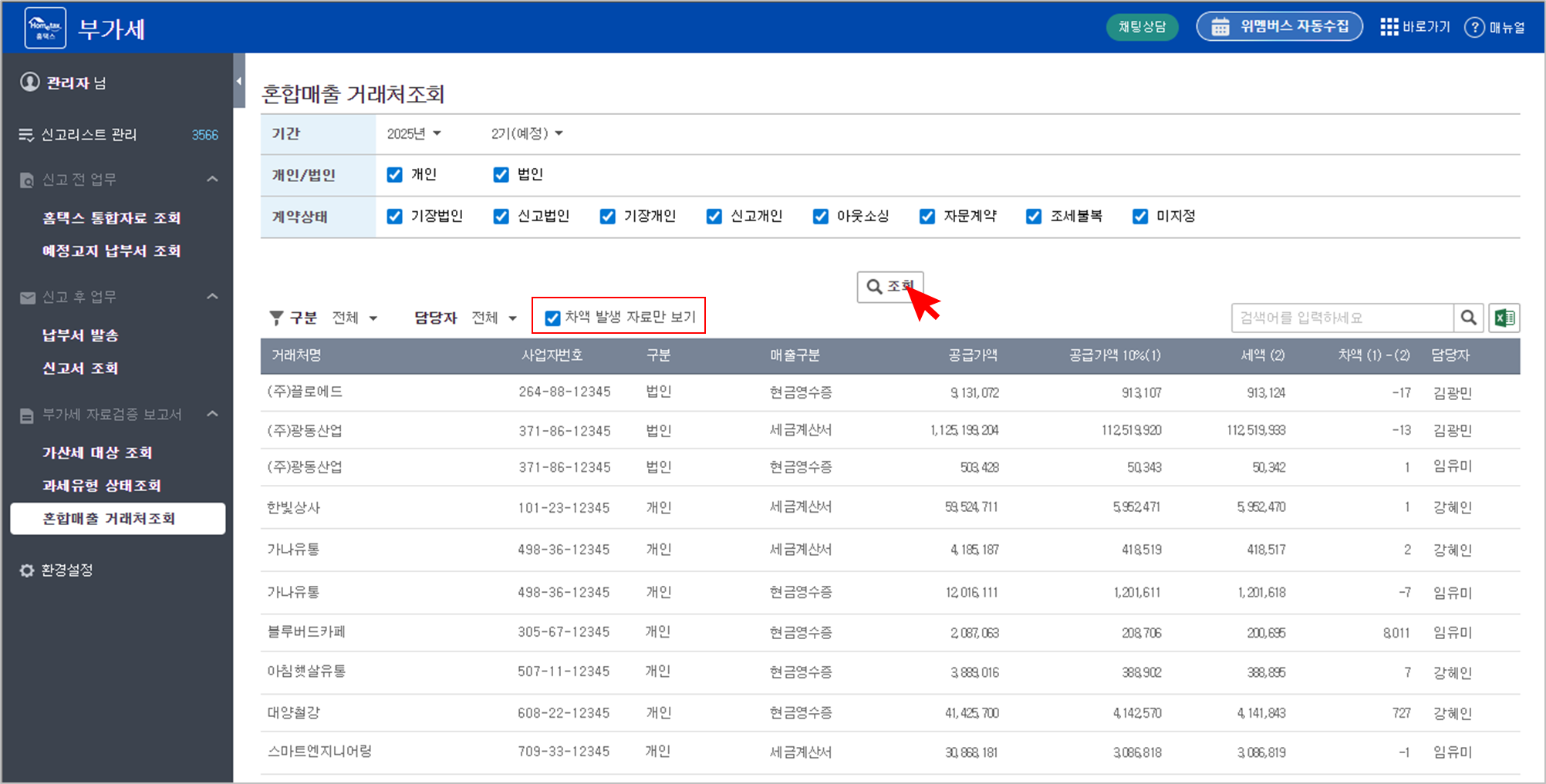 메뉴위치 : [부가세 앱 > 부가세 자료 검증 보고서 > 혼합매출 거래처조회]