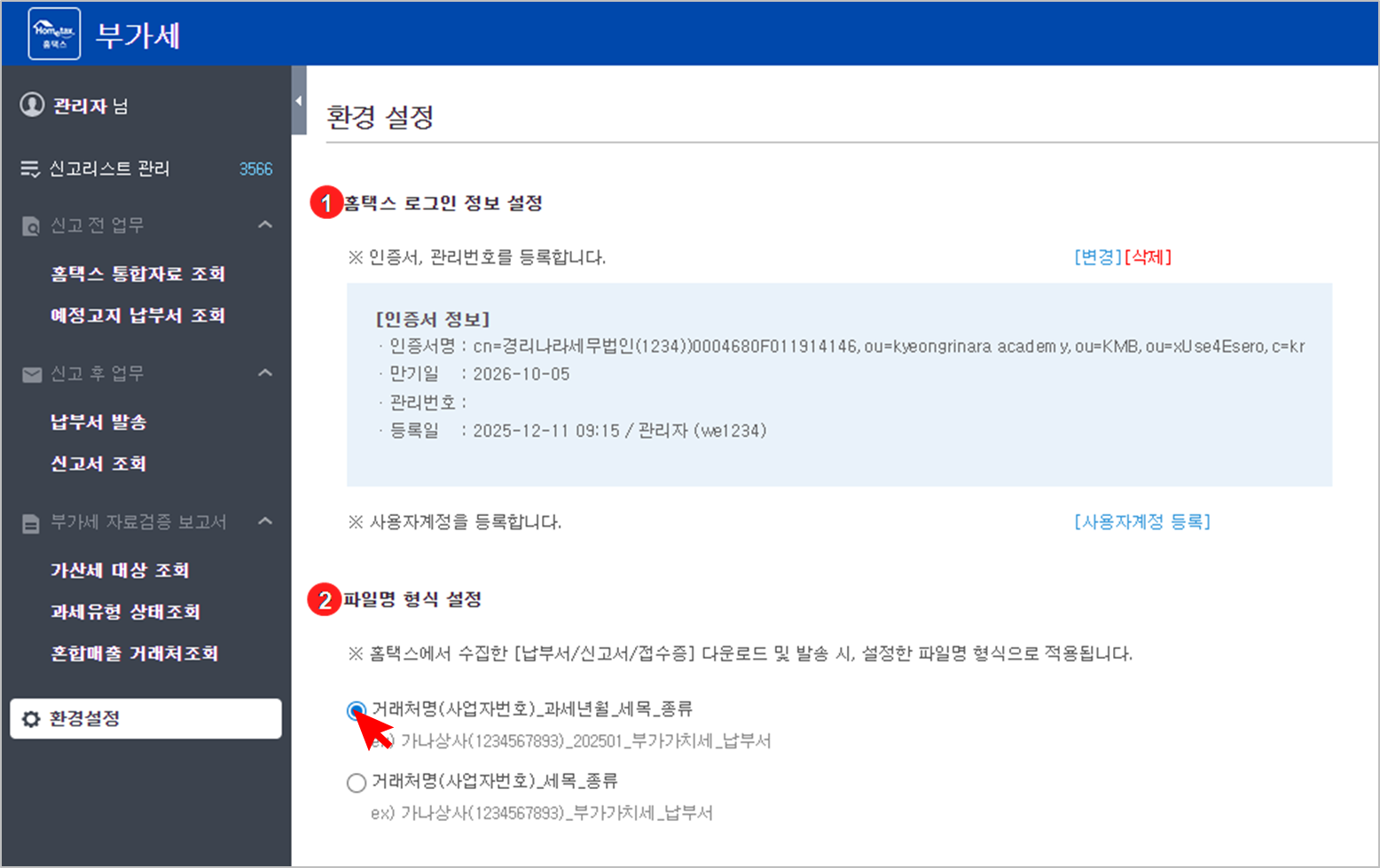 홈택스 인증서 등록 및 파일 다운로드 시 파일명 형식을 설정할 수 있습니다.