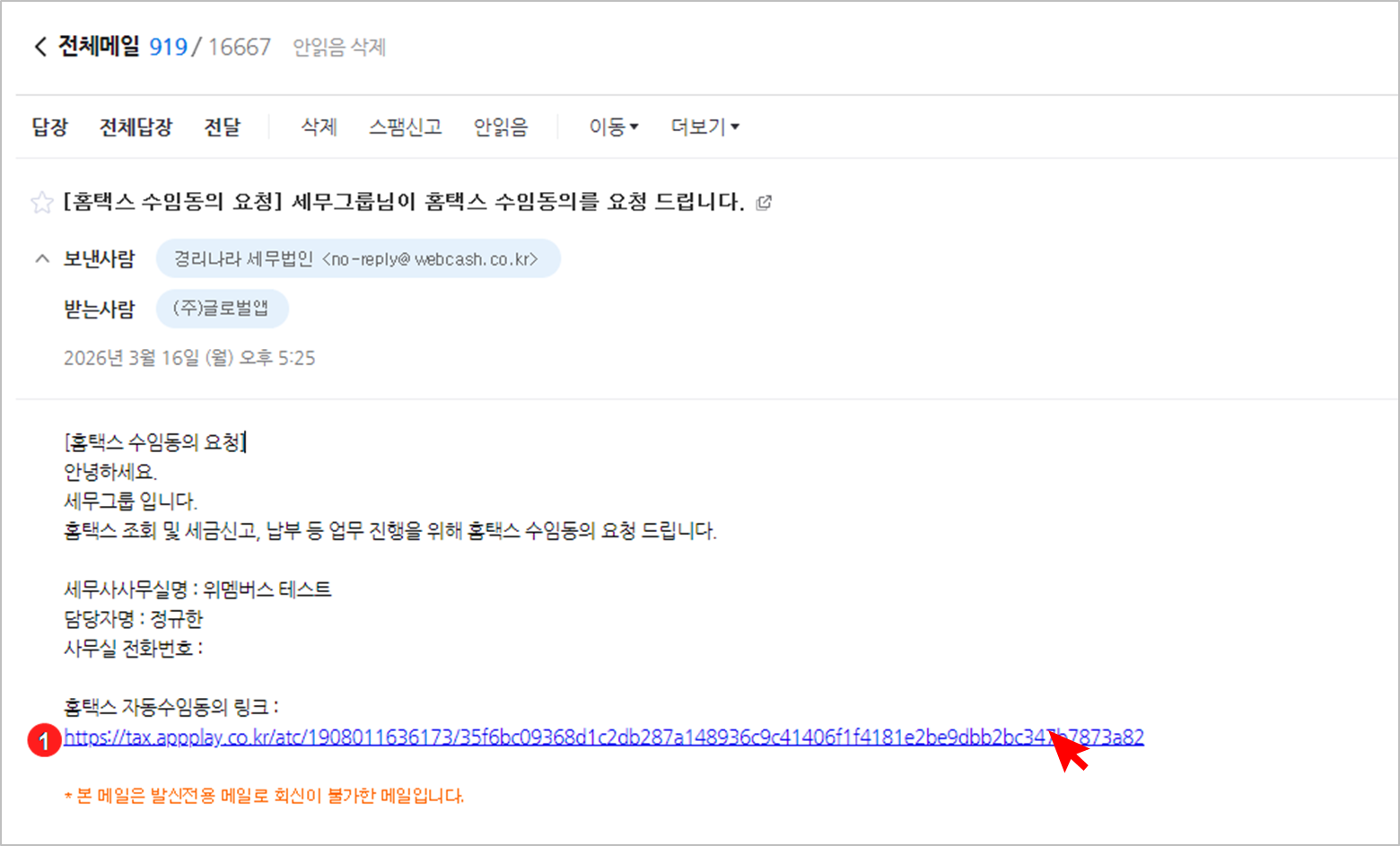 수신자(사업자)는 별도의 로그인 없이 메일 내 링크를 통해 즉시 수임동의를 완료할 수 있습니다.