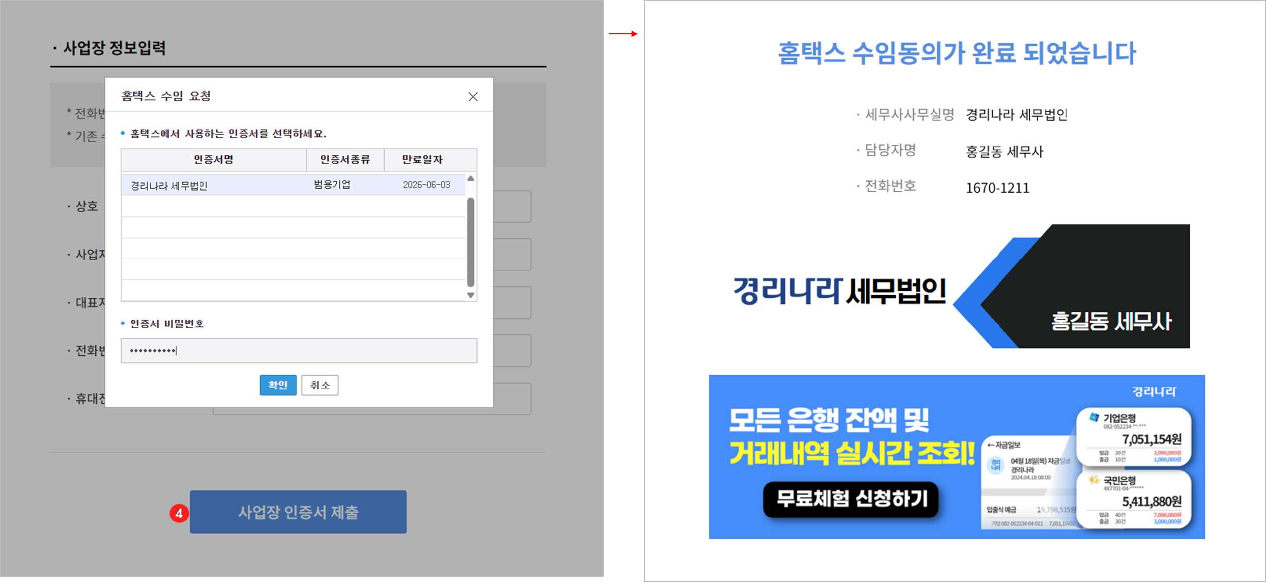 ④ 인증 완료 : 홈택스 인증서 암호를 입력하면 간편 인증 절차에 따라 홈택스 자동 수임동의가 최종