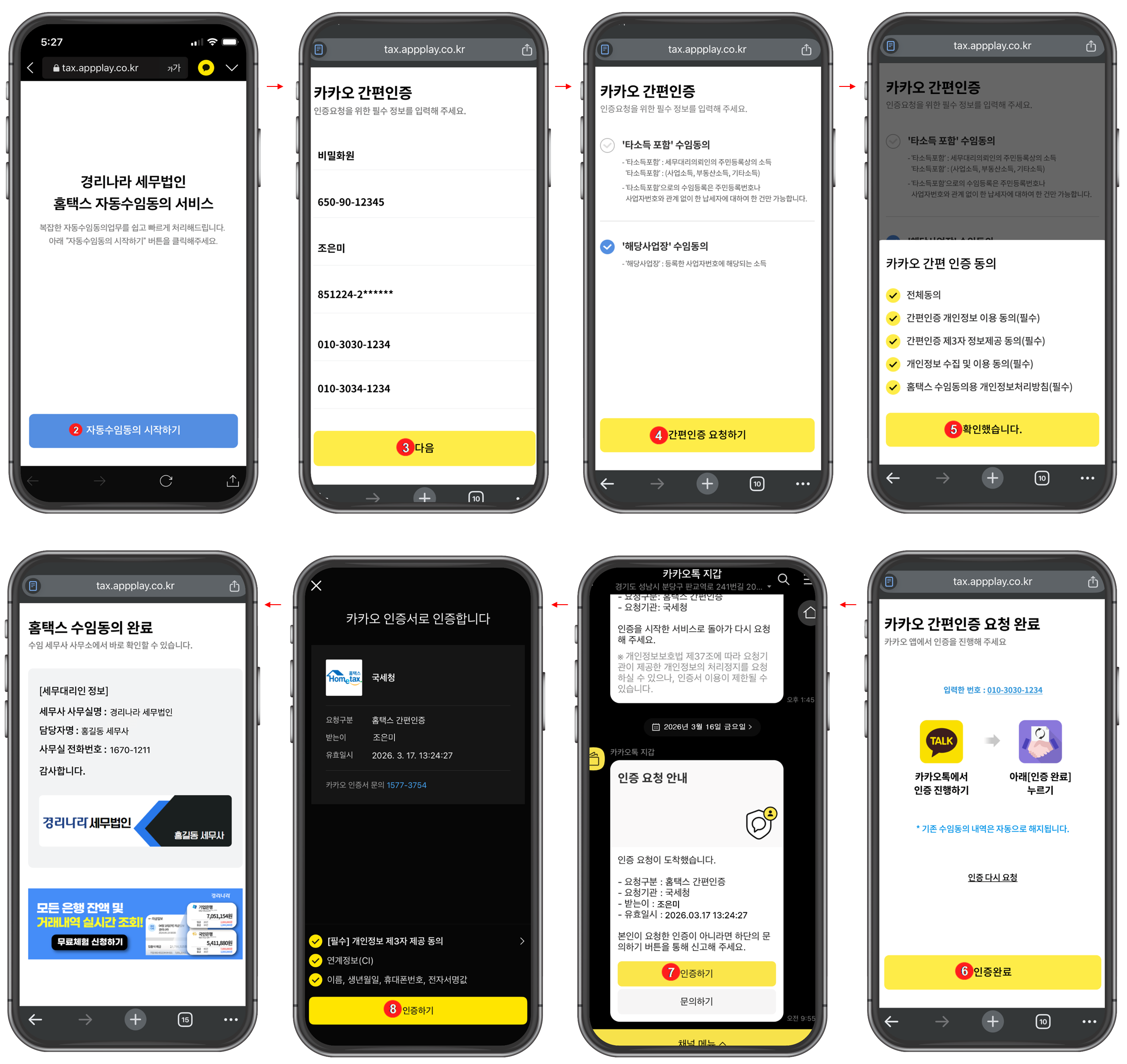 ②~⑧ 간편 인증 : 화면 안내에 따라 정보를 입력하고 카카오 간편인증을 진행합니다.