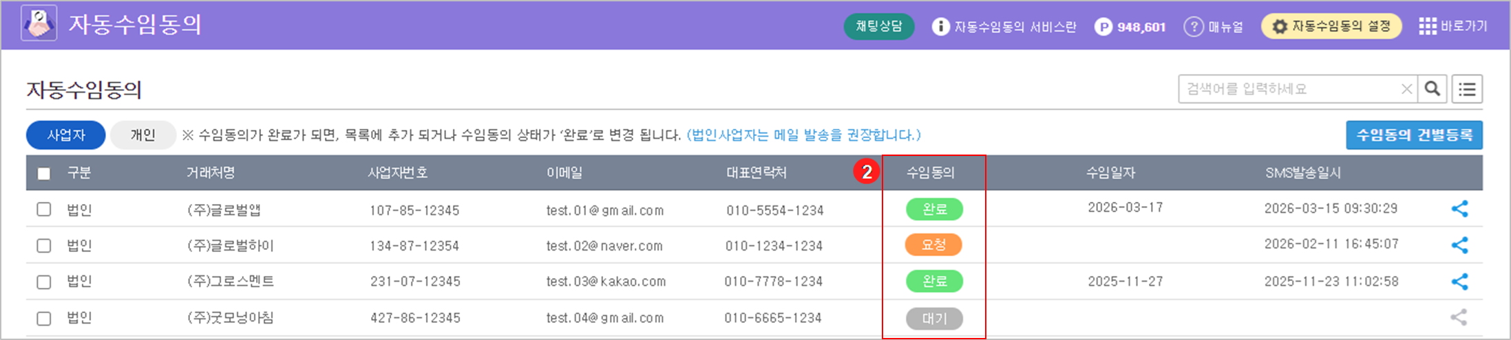 2️⃣ 법인 사업자 (대기) : 정보 저장 시 '대기' 상태로 생성됩니다. 이후 [전송] 버튼을 눌러 수임처