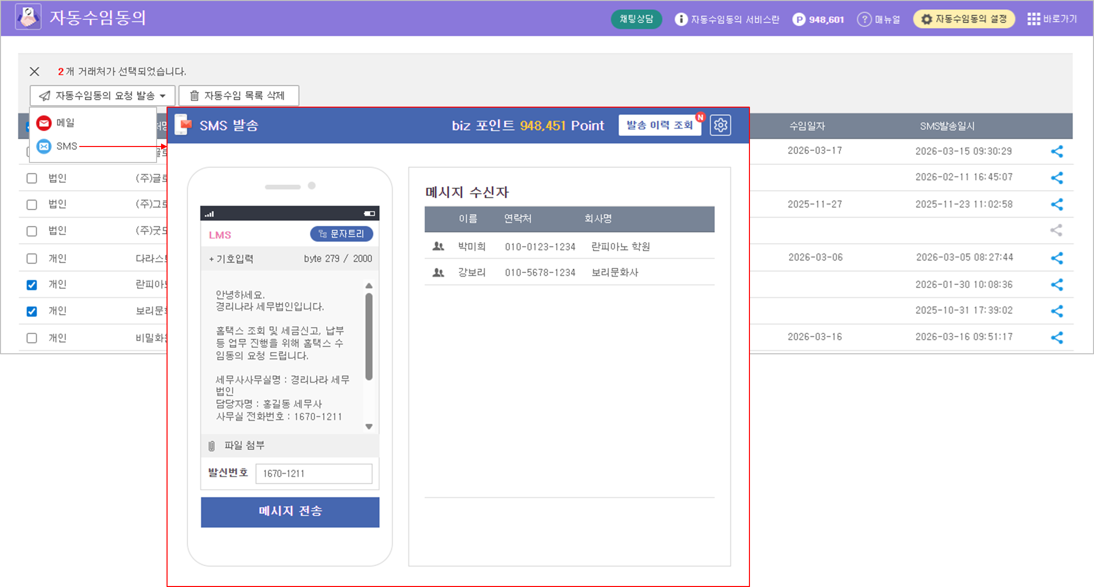 1️⃣ 개인 사업자 : [SMS로 수임동의 요청]을 클릭하여 즉시 요청을 보낼 수 있으며, 발송 전 본문