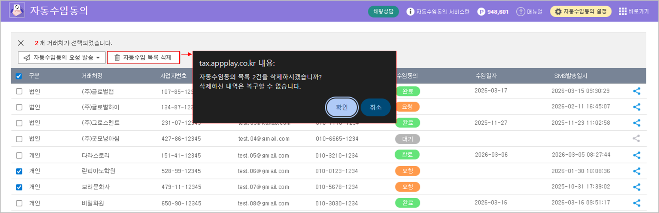 삭제할 거래처를 선택한 후 [자동수임 목록 삭제]를 클릭하여 삭제 가능하며, 수임동의 상태와 상관없이 모든 데이터의 일괄 삭제가 가능합니다.