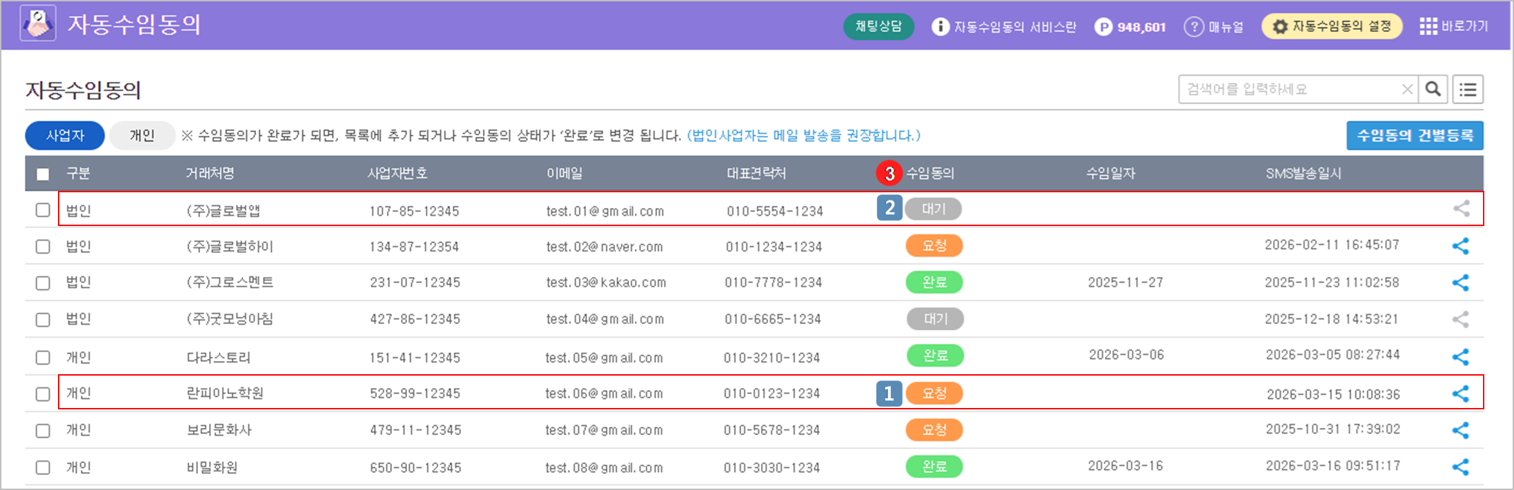 메일 전송이 완료되면 수임동의 상태가 '요청'으로 변경되고 메일 발송한 시각은 'SMS발송일시' 항목에서 실시간으로 확인할 수 있습니다.