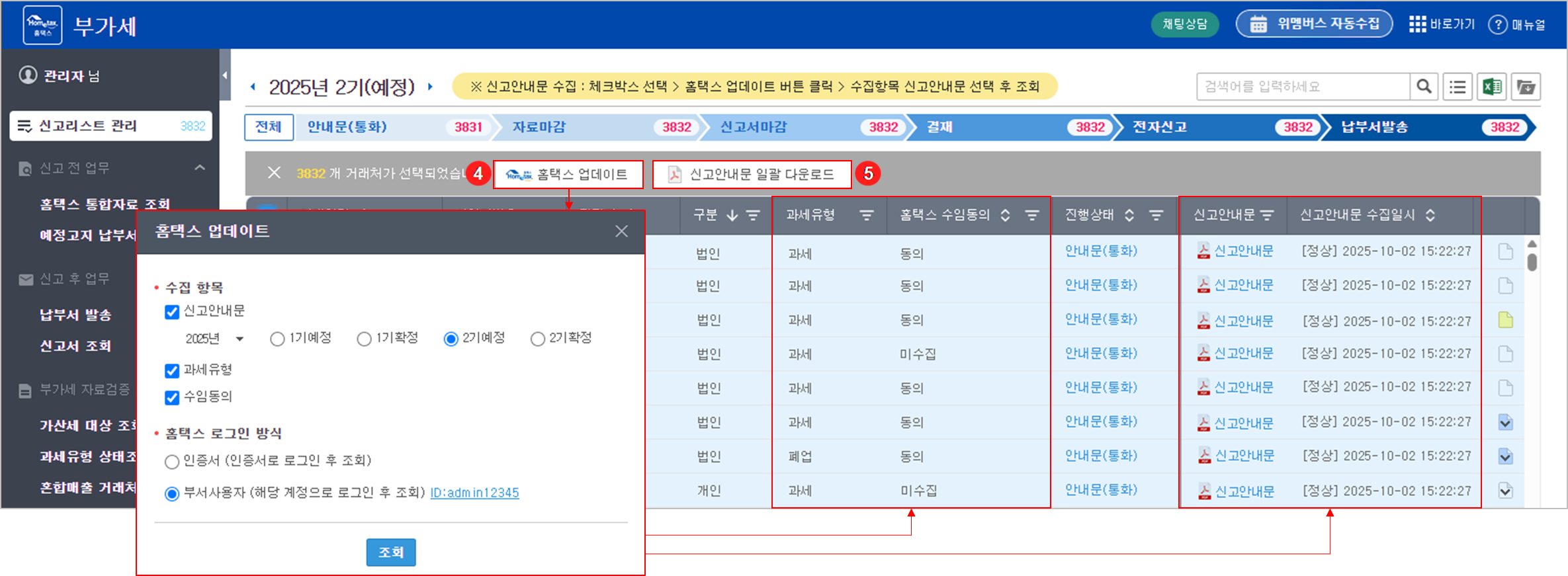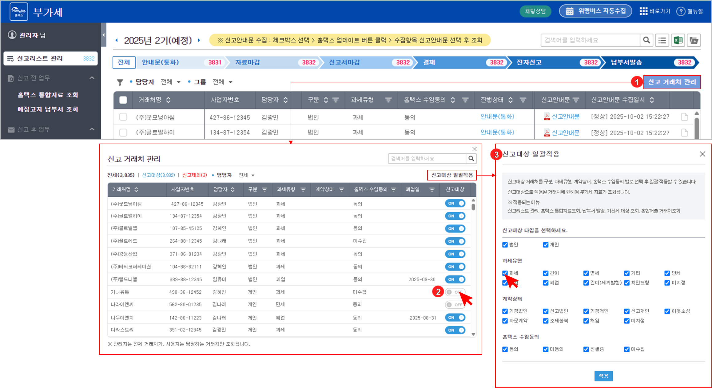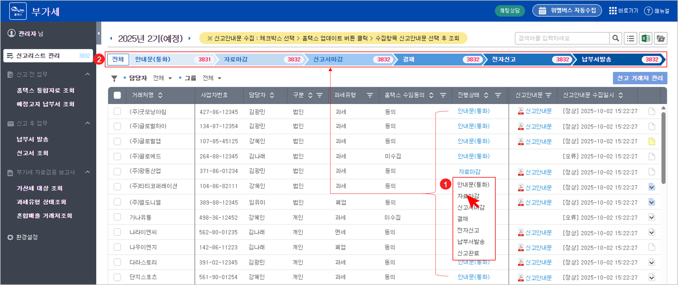 과세유형 및 홈택스 수임동의 항목은 [수임처 > 거래처 조회] 메뉴의 홈택스 업데이트를 통해 자동 반영되지만, [부가세 > 신고리스트 관리] 메뉴에서도 직접 업데이트할 수 있습니다.