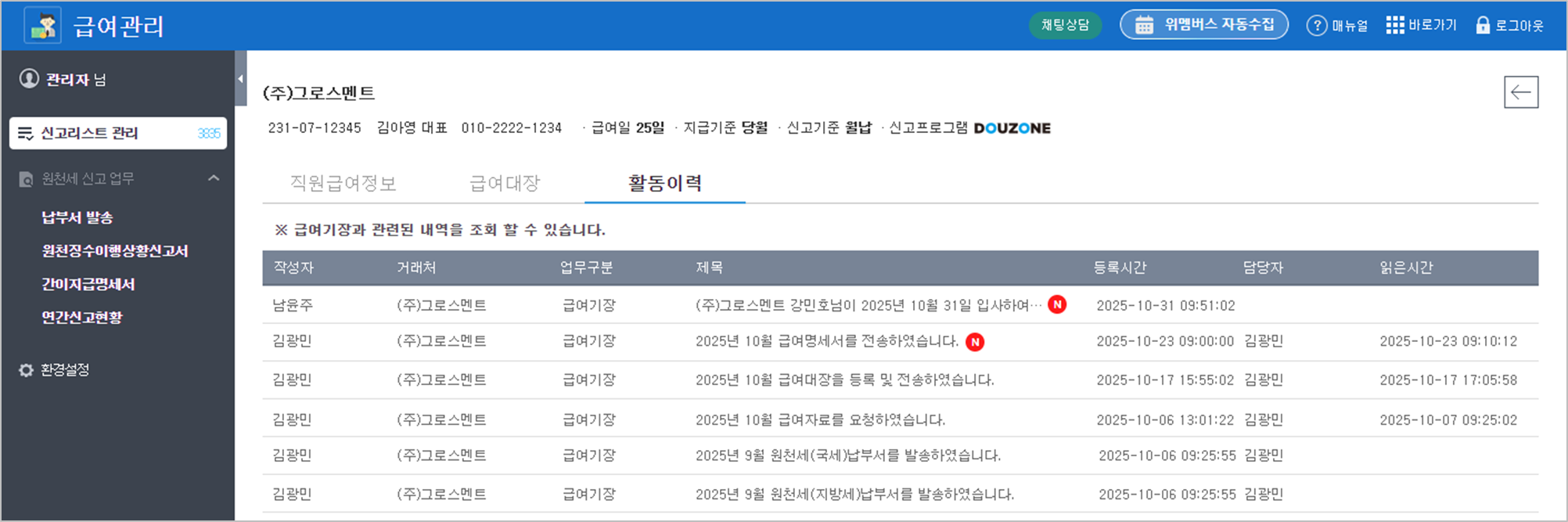 거래처의 직원 급여정보, 급여대장, 수임처 전송 이력을 한눈에 통합 관리할 수 있습니다.