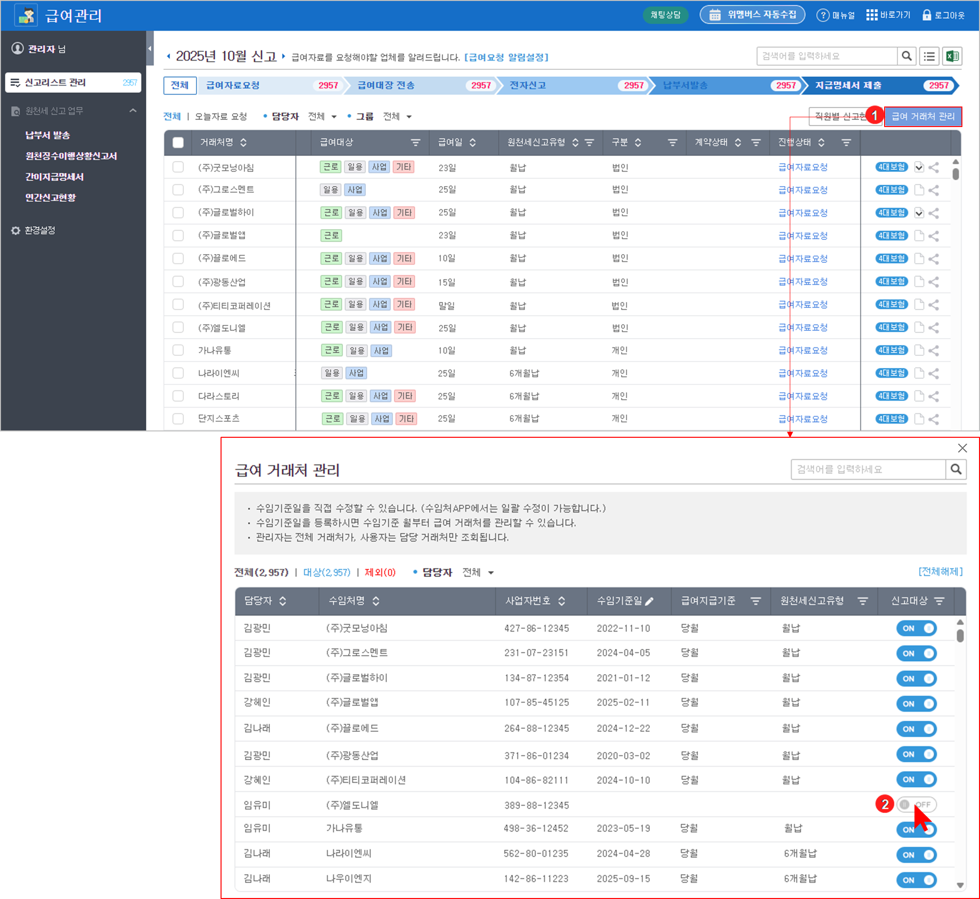 급여관리 앱은 [급여 거래처 관리] 메뉴에서 'ON'으로 활성화된 거래처만 표시됩니다.