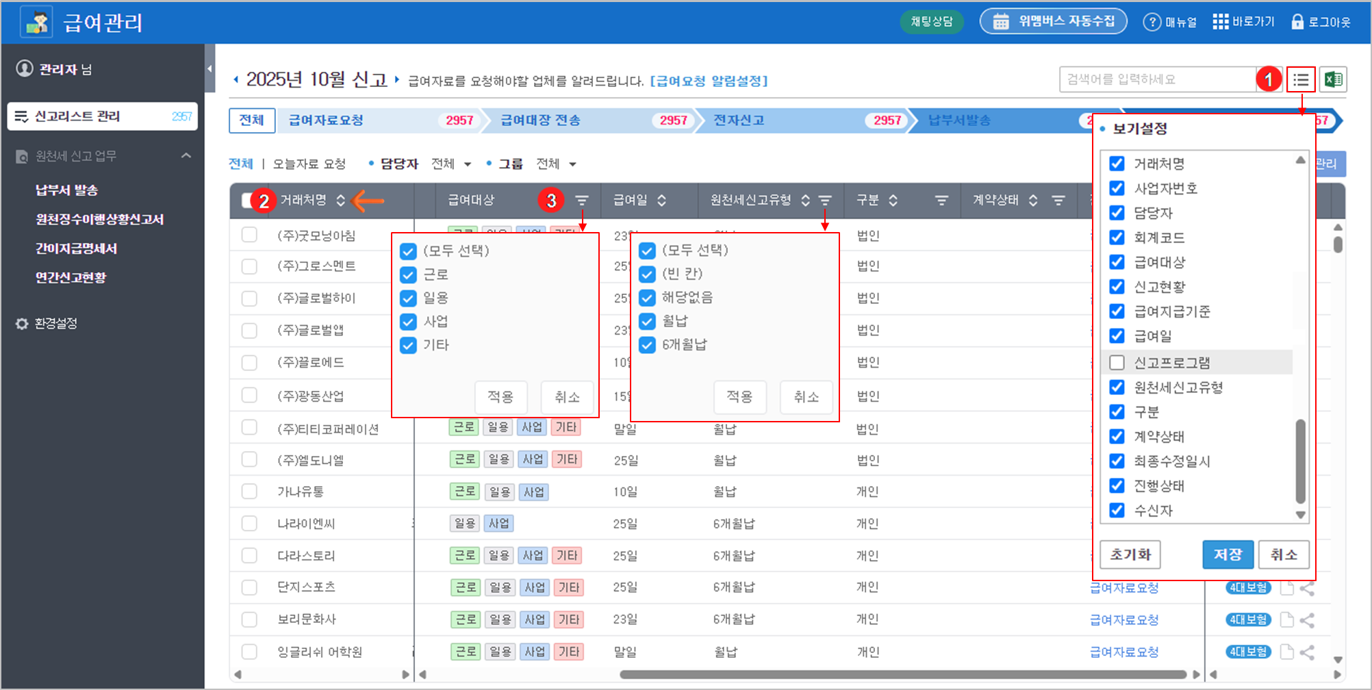 - {보기설정} 아이콘(≡)에서 항목을 추가할 수 있으며, 신고 완료 후 '일반/일용/사업/기