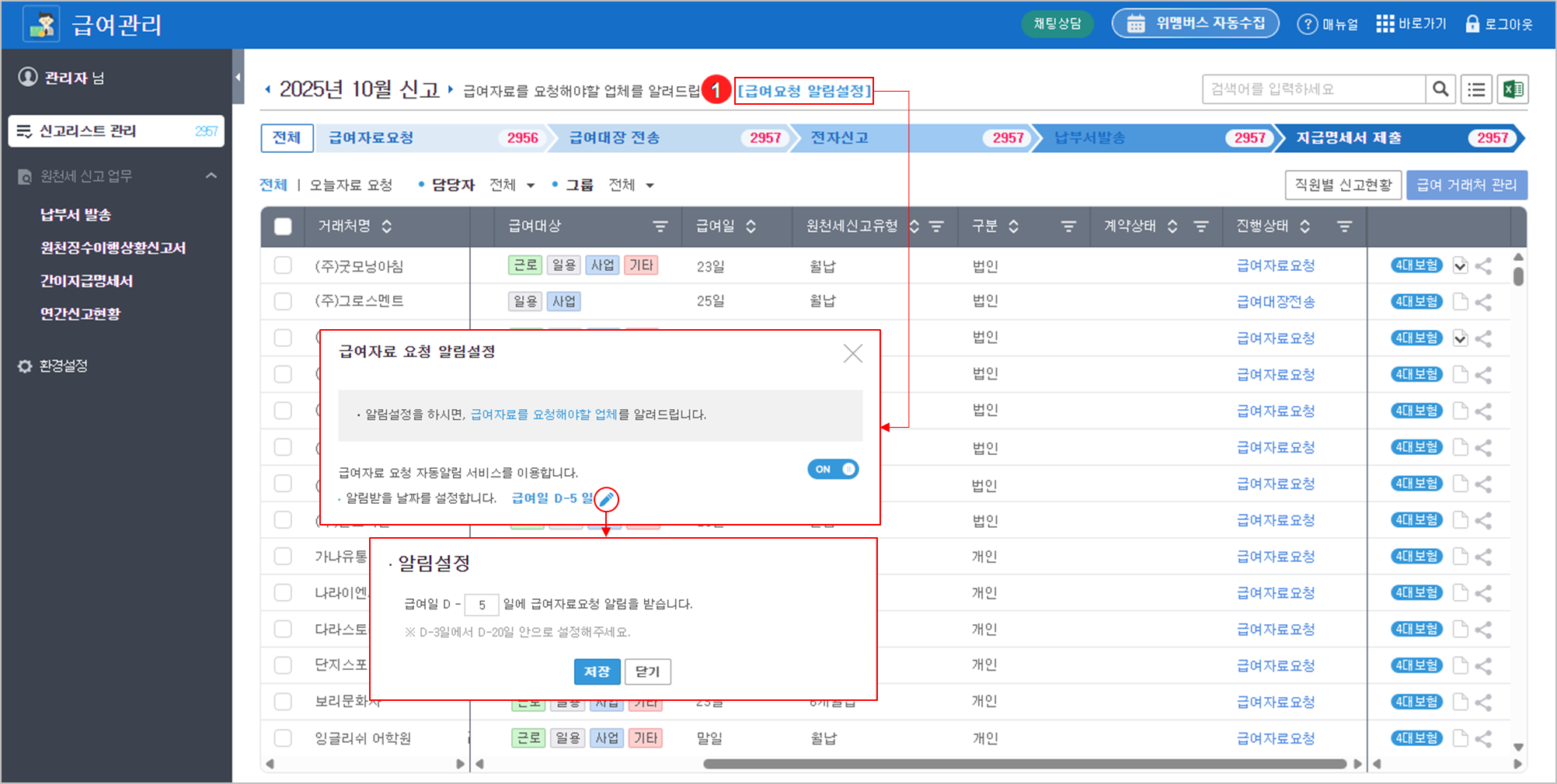 설정된 일정에 따라 급여자료 제출 요청 알림을 일괄 또는 개별로 발송하여 자료 제출 누락을 방지할 수 있습니다.