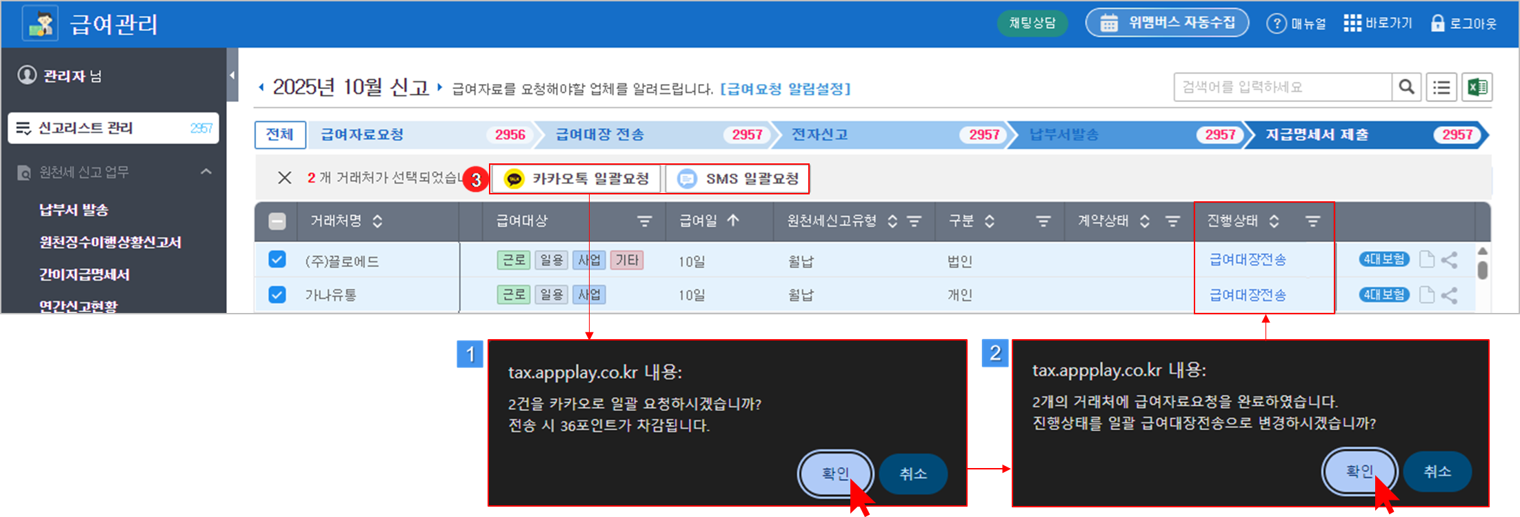 ✅ 메시지 2 : [확인]을 클릭하면 선택한 거래처의 진행상태가 '급여자료요청' → '급여대장전