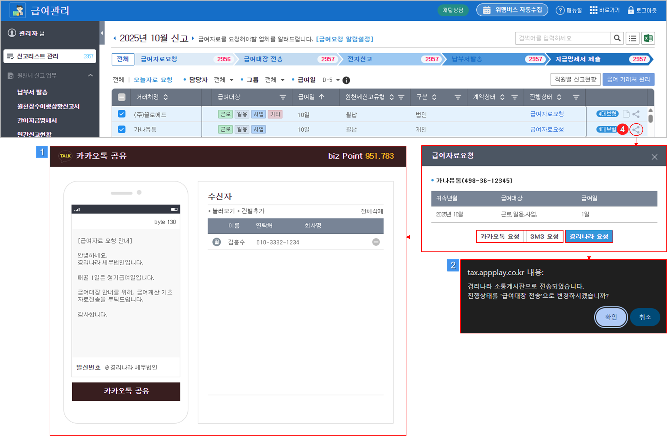 카카오톡 요청(건당 18 Point 차감 : 수임처로 급여자료 요청 알림톡이 전송됩니다.