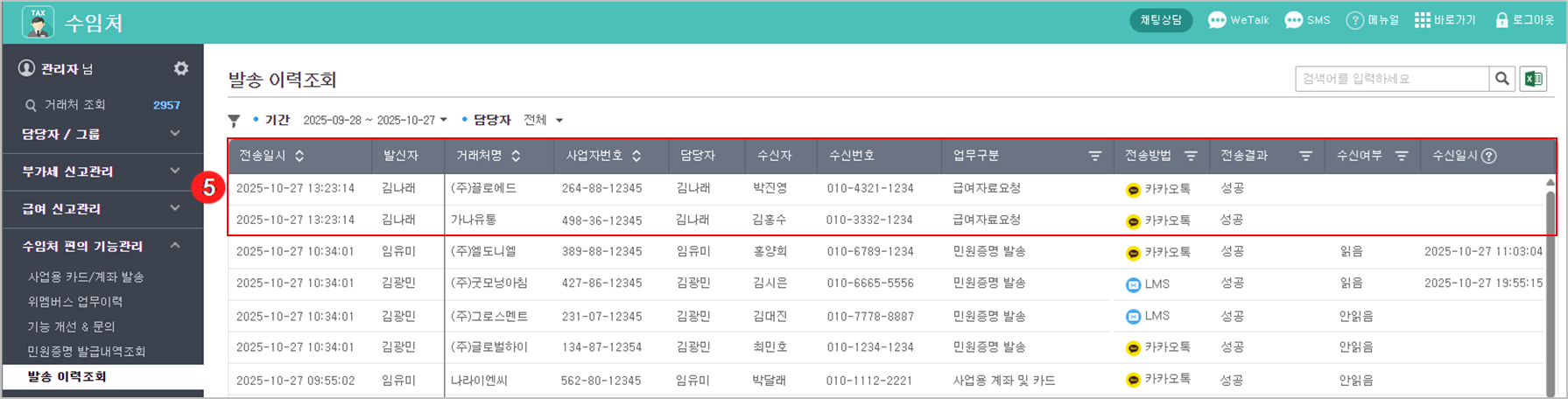 [수임처 앱 > 발송이력 조회] 메뉴에서 급여기초자료 전송일시 등을 확인할 수 있습니다.
