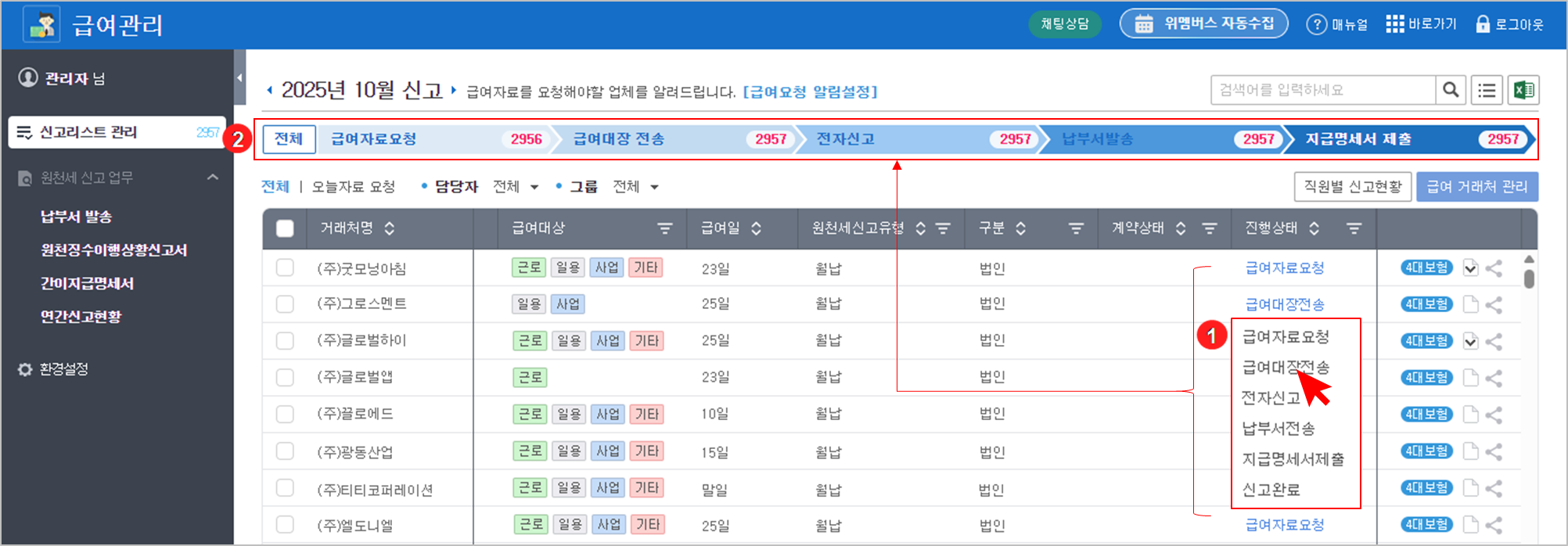 '급여대장 전송' 단계는 자동 변경되며, 나머지 단계는 수기로 상태를 변경해야 합니다.